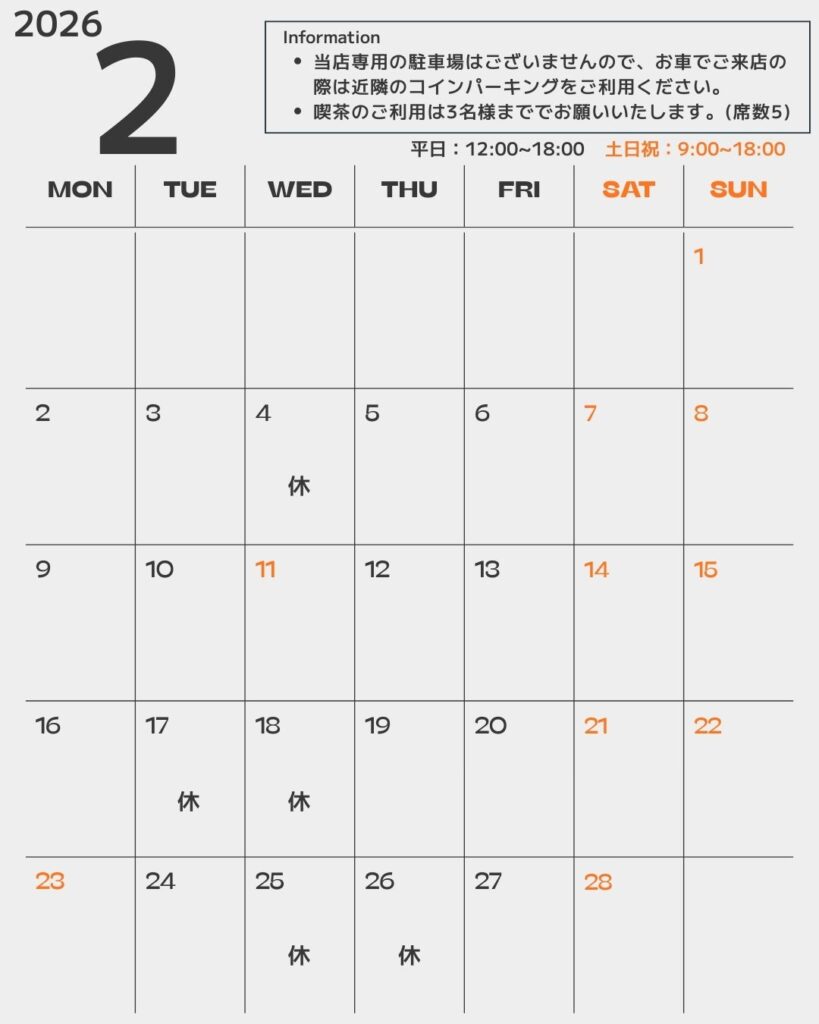 定休日はカレンダーを参照ください。