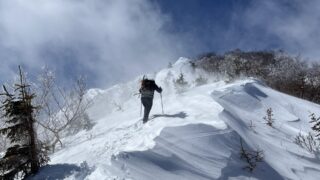 ずっと気になっていた白砂新道。冬は通行止めになっているのですが、ちょうど開通したばかりだったので、この機を逃してはならないと意を決して進みます。序盤は沢沿いを進んでいき、その後は度々現れる急な尾根との格闘。ようやく樹林帯を抜けると、ザレた道をトラバースしながら最後の急登を上がります。なかなかに登りごたえのある道でしたが、変化に富んで面白く、時間と体力に余裕があればおすすめしたい道です。