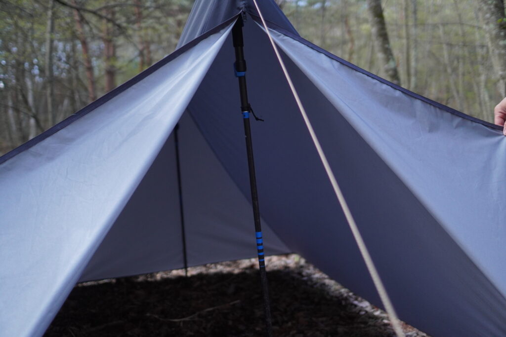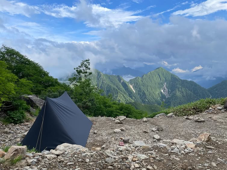 どこか懐かしさを感じる三角のシルエットに、近年主流になりつつある軽量化された道具たちのエッセンスが組み合わさったこのシェルターは山でも一際存在感を放ちます。