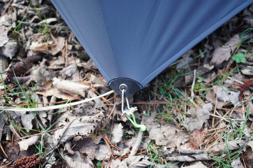 張り綱を通す部分とペグダウンする四隅はレザーで補強。