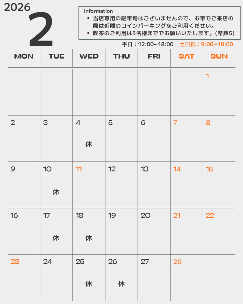 定休日はカレンダーを参照ください。