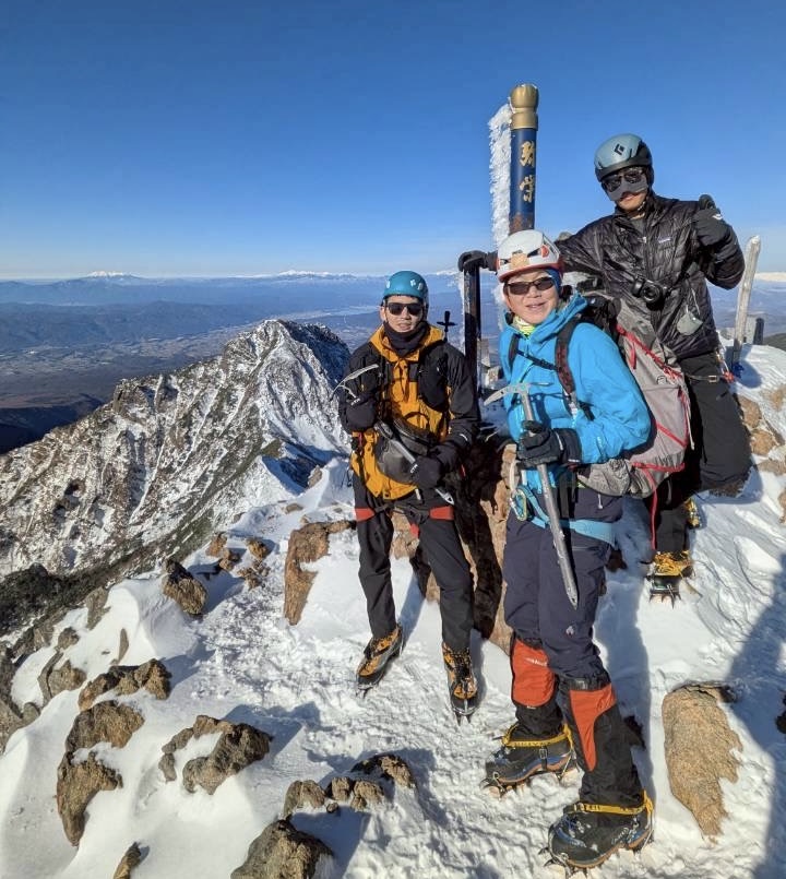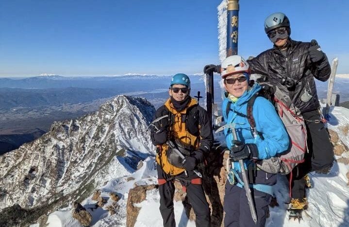 終盤の岩稜を抜けて赤岳登頂!山頂もほとんど無風で陽の光がさしてポカポカでした。しばし景色を眺めたり撮影を楽しみました。