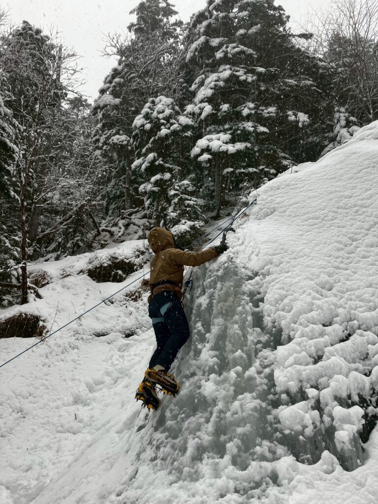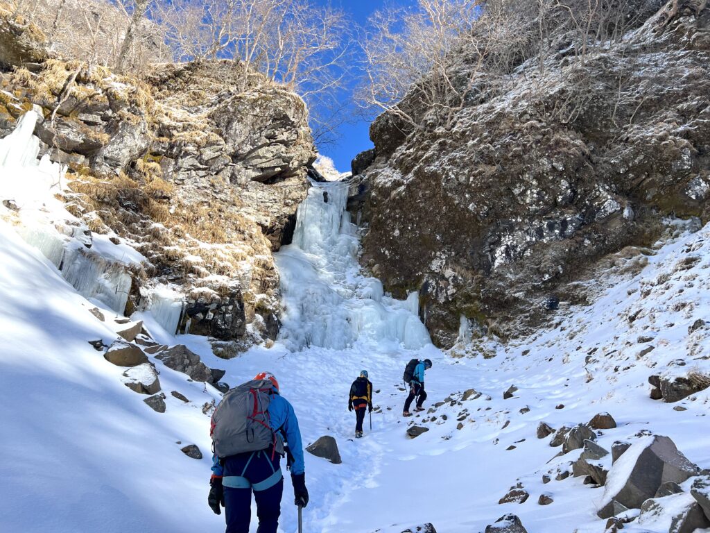 この回は凍った滝の上に雪が積もっていました。氷の様子を探りながら慎重にアックスを振ります。前の日程よりも簡単な滝を選んで登りましたが、皆さん安定した登りで3本ずつ完登しました。