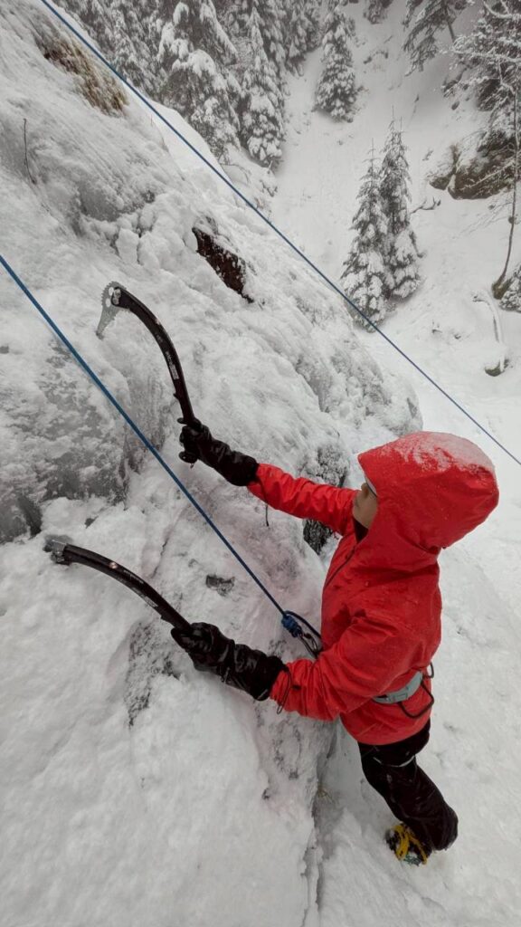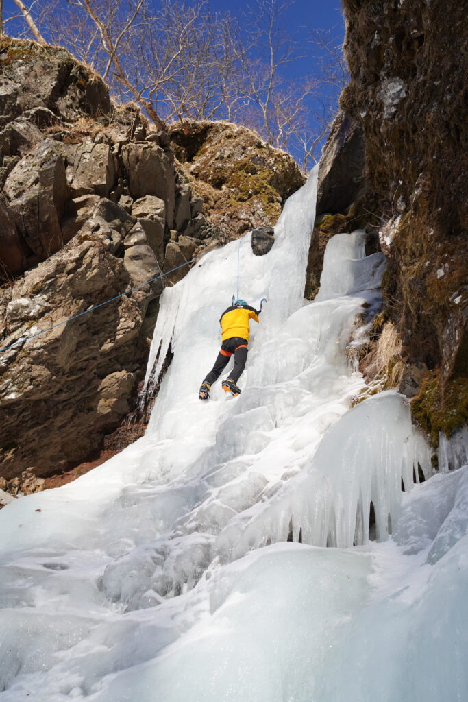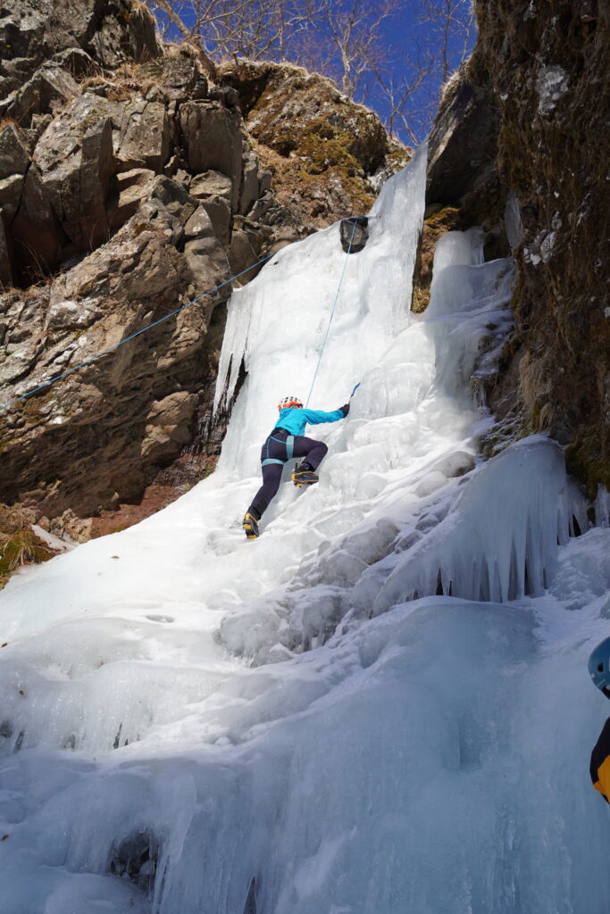 まずは新名ガイドがお手本がてらリードで登り、トップロープを張っていただきました。アックスの振り方や足の置き方等の基本を教えてもらい、参加者の皆さんもトライ。中盤の垂壁で腕がパンプしてしまい苦戦しつつも、徐々に動きが良くなっていました。