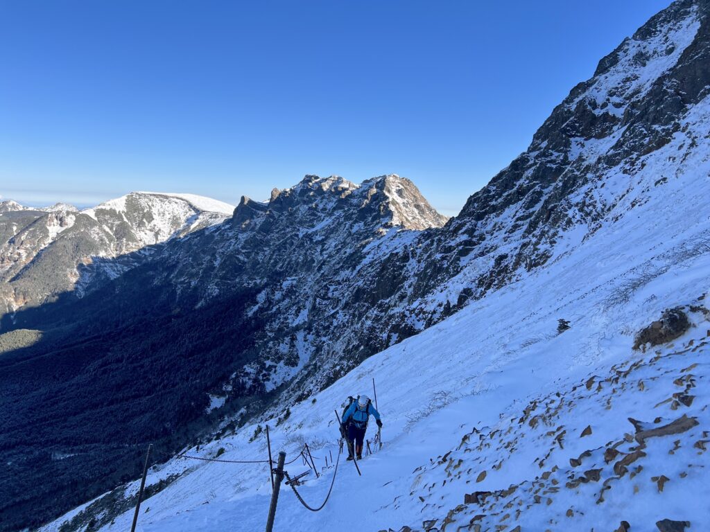 一日目のアイスクライミングでは簡単な滝を登りつつ、アイゼンの前爪に乗る感覚を掴みます。アイゼンと仲良くなったところで、二日目はアイゼン・ピッケルを駆使して八ヶ岳の主峰、赤岳を目指します。