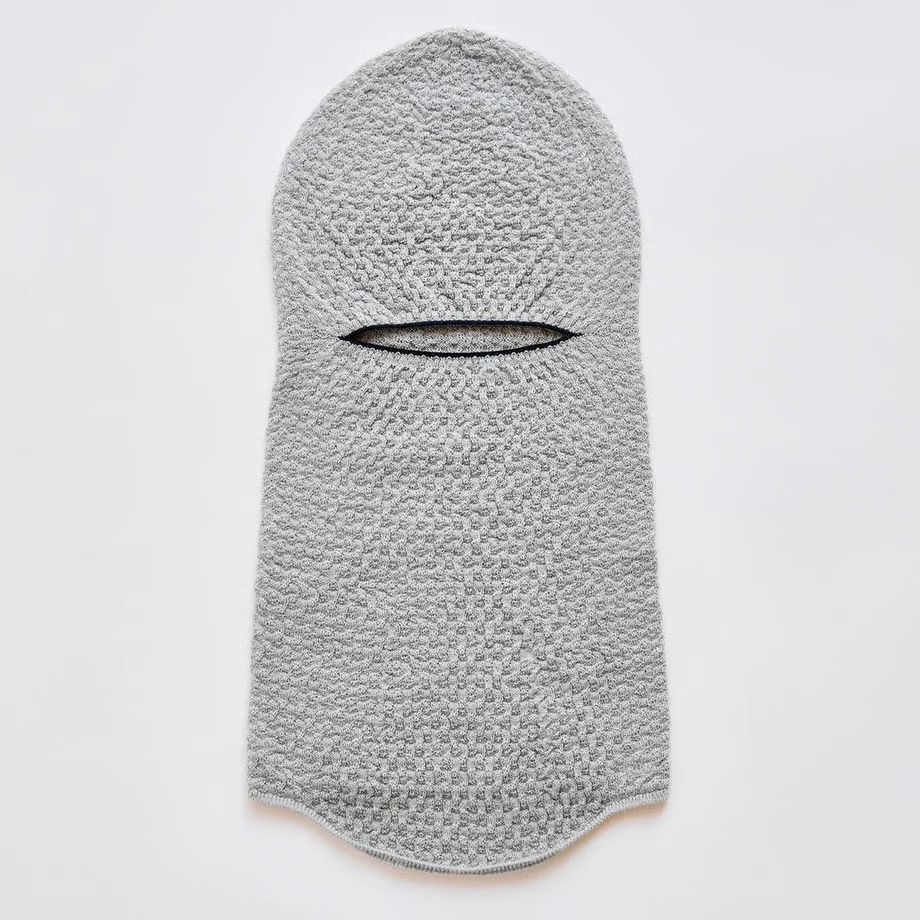 スーパーエクストラファインメリノウールとBRING Material™の再生ポリエステルを70:30の割合で配合したニットのバラクラバ。