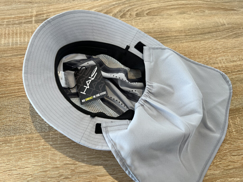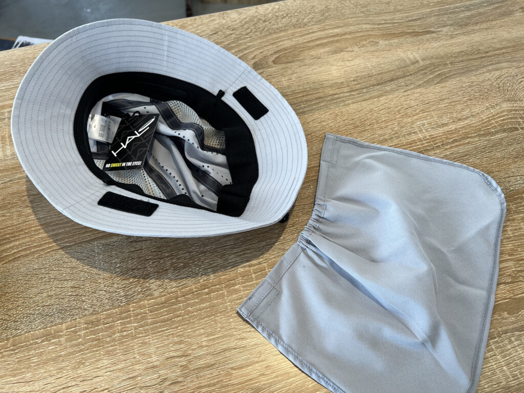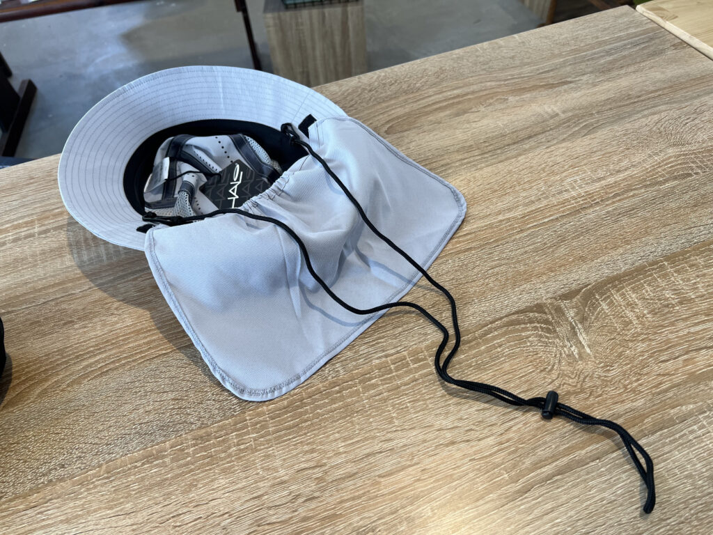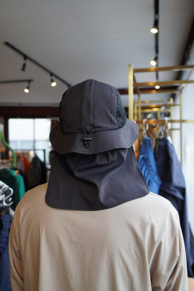 一番の特徴である首元の日焼け防止のシェード。こちらは2箇所のマジックテープで本体に固定されており、簡単に着脱可能です。手ぬぐいを巻いたり、最近では日傘を差す人もいますが、このシェードはシンプルかつ熱がこもらないので、ジリジリと日が照りつける夏の稜線上で重宝します。
