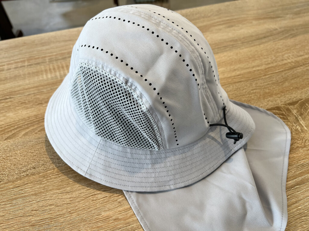 サイドにメッシュ生地を採用し、トップパネルにはパンチング加工を施してあります。これにより通気性が良く、熱の籠もりを抑えつつ、頭頂部の日焼けを防止します。