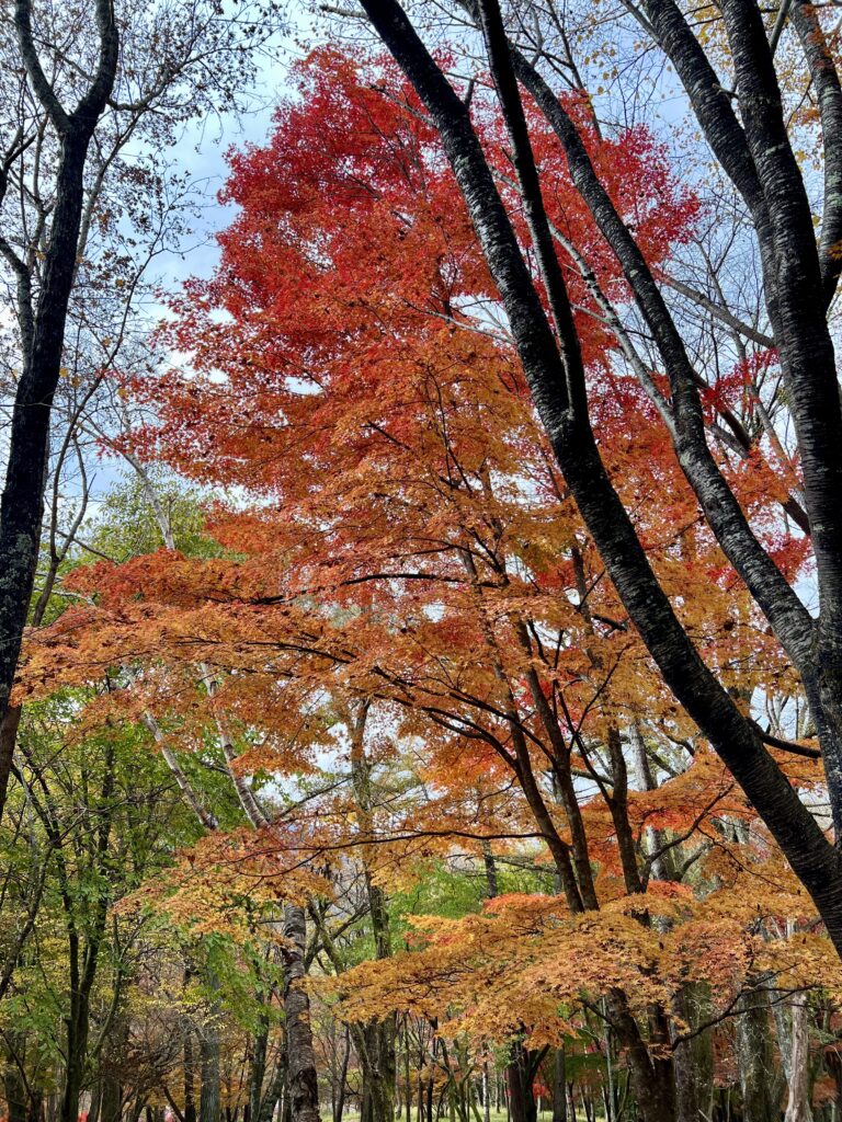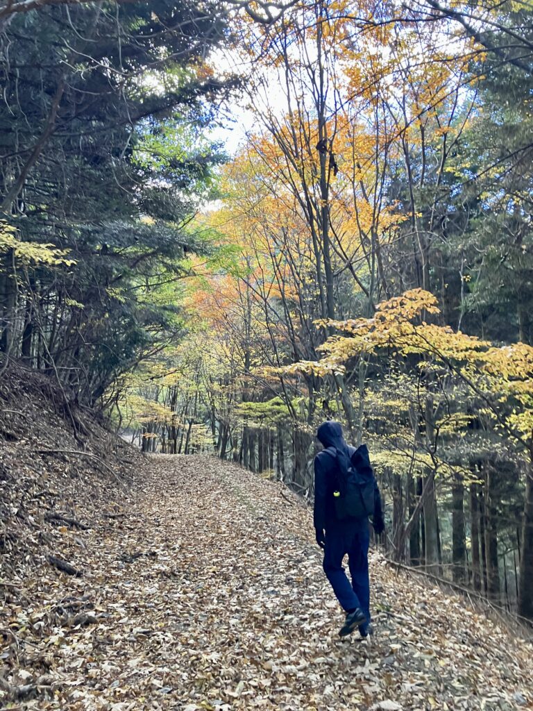 尾根の途中で堰堤の整備に作られたのであろう古い作業道に入り、地図を読みながら駐車場を目指しました。駐車場手前の遊歩道が紅葉のさかりで、ちょっとオトクな気分に。偶然の出会いも山の醍醐味ですね。