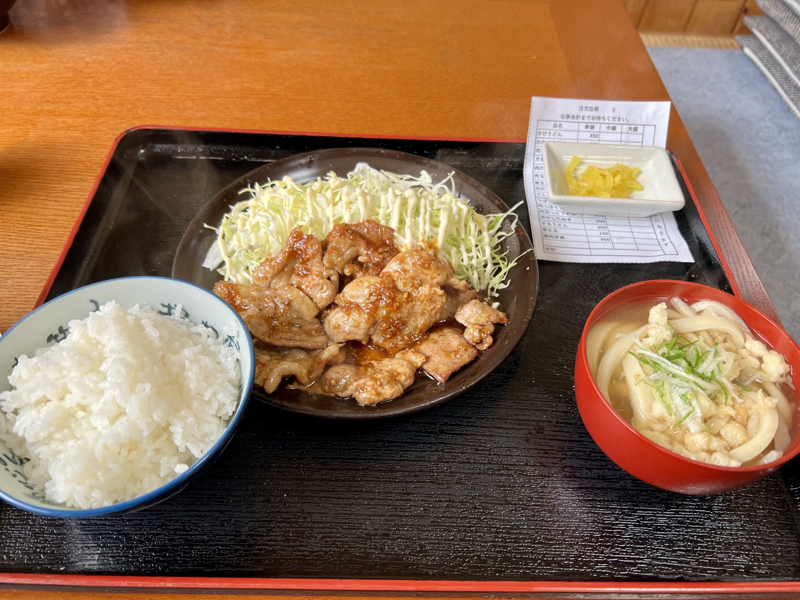 夫は焼肉定食を頼んでいました。待ち時間に隣のテーブルに座っていた働き盛りの男性たちがこぞって注文していた定食。実のところうどん屋で「定食」という文字を初めてみたので、いったいどんなものなんだろうかと期待と不安が入り混じった気分のところ、ちょうど店員さんが運んできたお盆から、ニンニクのいい香りがふわ〜と漂ってきました。厚めのお肉にニンニクがしっかりと効いたタレを絡めて、千切りキャベツを巻いて一緒にご飯をかきこむ…ここ最近で食べた「定食」の中で一番だったそうです。