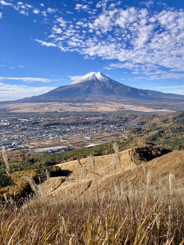 途中いい感じの尾根を見つけショートカットして稜線に出ると、富士山とススキがどーんと出現。この大きさの富士山を見ると、帰ってきたなあと感じます。