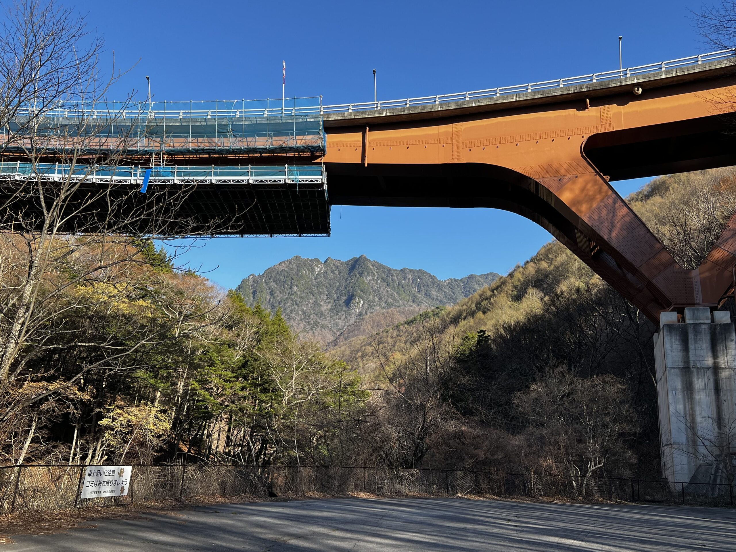 遠くに駐車場の上を走るループ橋や富士山、大菩薩方面の山々が見えて気持ちよかったです。