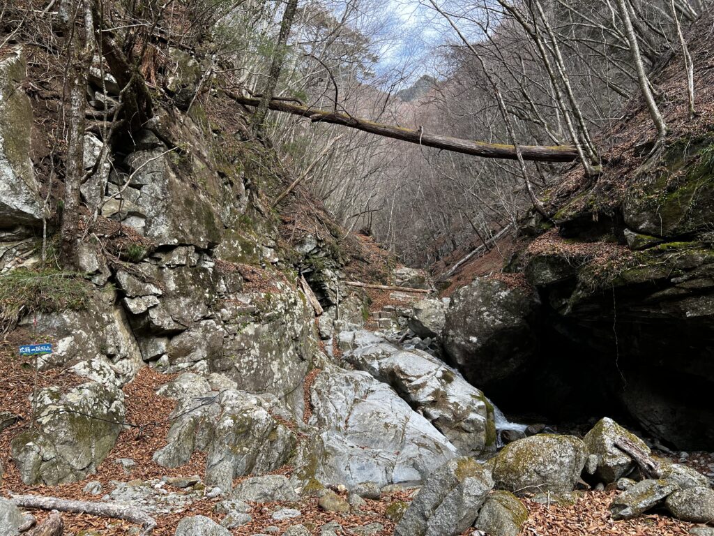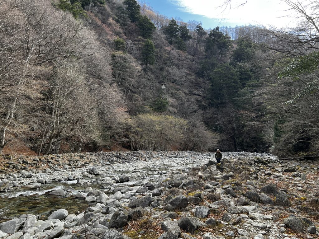 河原をしばらく進み、鶏冠谷の出合いで渡渉して向かって左の尾根に取り付きます。