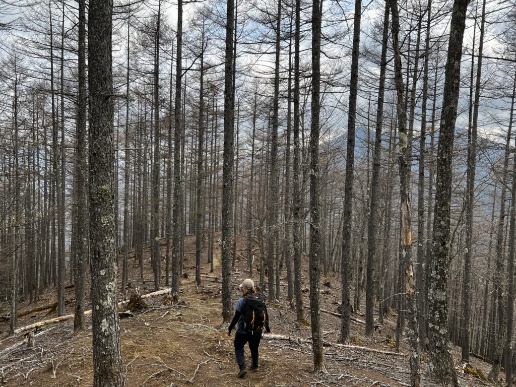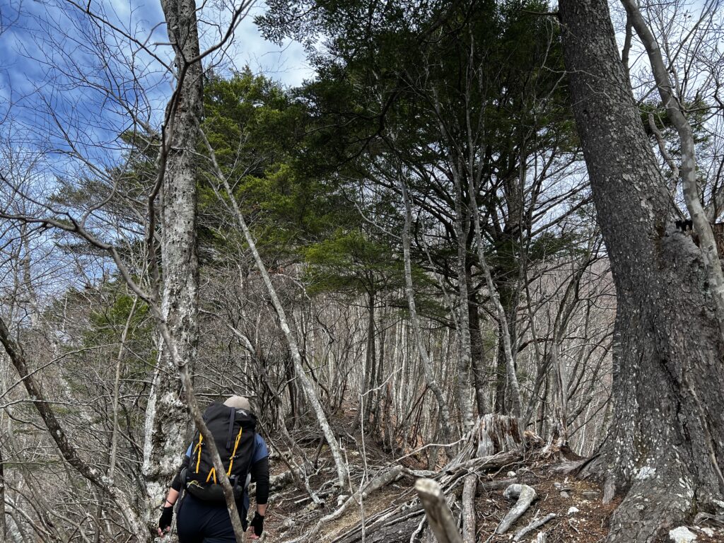 出だしから急登が続きますが、トレースがしっかり付いており登りやすいです。しかし漫然と歩いていると獣道に誘われていつの間にかトラバースしていたりするので油断は禁物です。まだ新緑には早いですが、カラッとした山に響き渡るヤマガラの鳴き声がなんとも心地良かったです。