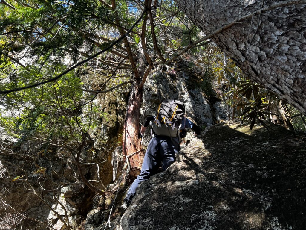主尾根との合流地点のチンネのコルに近づくと徐々に手を使って登る箇所が現れ始めます。登りは良くても下っていくのは嫌そうな道が続きます。岩を掴んだり時に木登りのようにグングン標高を上げていきます。