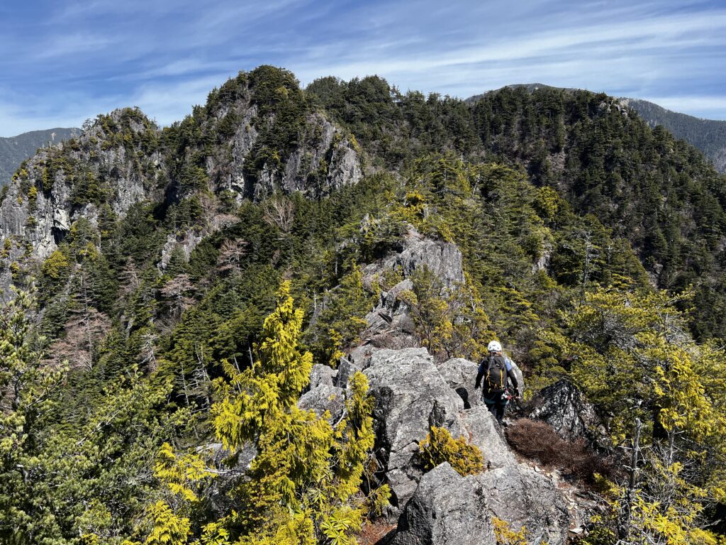 コルから暫く進むと、3つある主な岩峰のうちの1つ目が登場。手も足もホールドしっかりあり、快適な岩登りが楽しめます。
