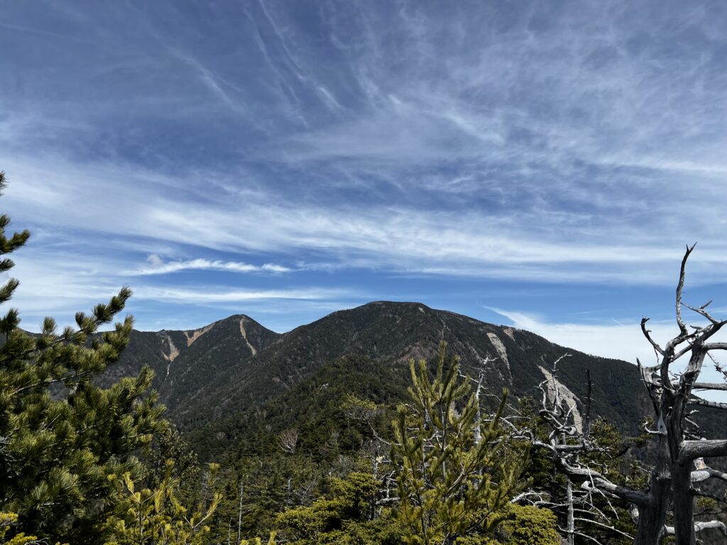 持ってきたパンを食べて木賊山方面に歩き出すと、次の2177m峰までに一度大きく下ります。懸念点だった藪の濃さもほどほどでしたが、木賊山山頂を目前にしてシャクナゲの海に迷い込んでしまい中央突破を試みたところ、腕や足が傷だらけになりました。シャクナゲの藪漕ぎはハイマツのようにベタベタしなくてよいのですが、バネのように跳ねっ返りが強いです。