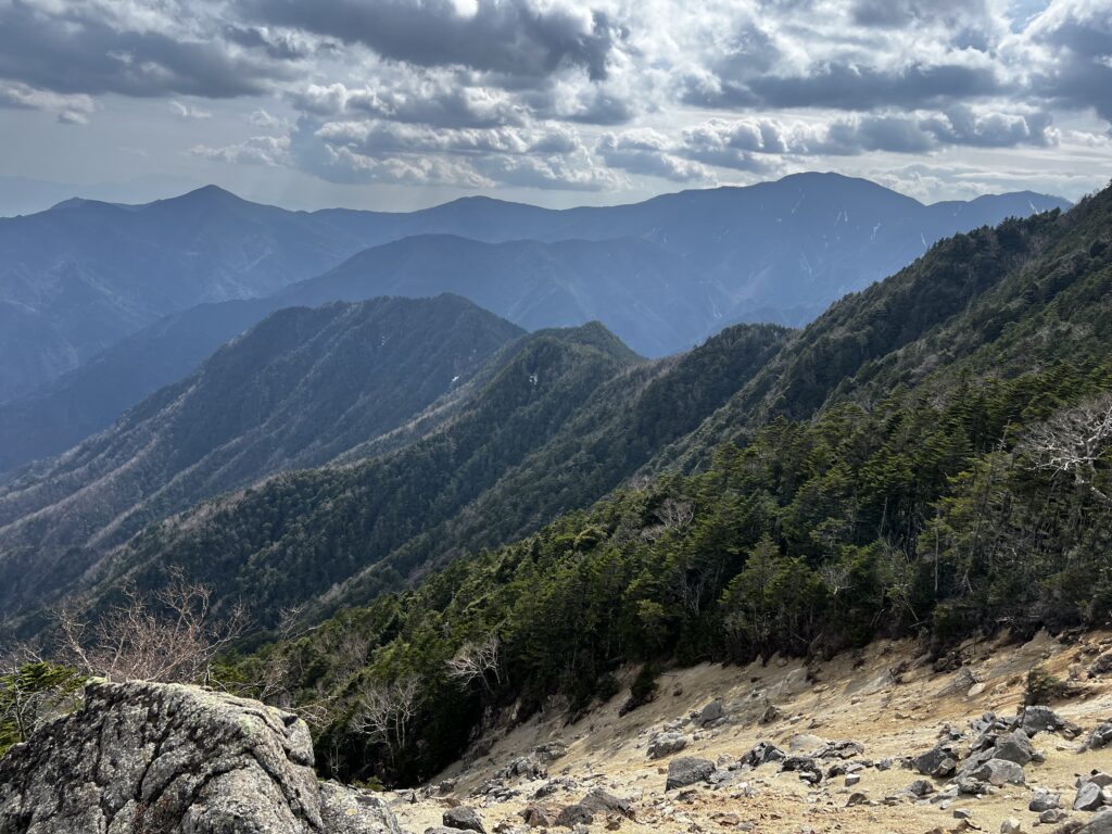 険しい縦走路から東に目を向けると、雁坂峠や水晶山、古礼山といった奥秩父主脈の中でも笹の草原が美しい山々を眺めることができます。この草原や、破風山周辺の立ち枯れた木が作り出す景色が好きで、甲武信ヶ岳〜雁峠は気づけば毎年のように歩いている、イチオシのエリアです。西沢渓谷を起点にぐるっと周回が可能なので、甲武信ヶ岳に登る際はぜひ足を運んで見てください。