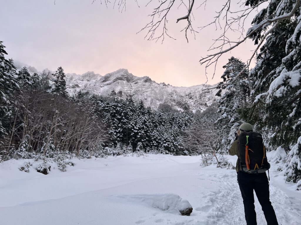 まだ暗い中、赤岳山荘の駐車場を5:15に出発。10日前にコラボMARSで歩いた時はあまり雪がなかった南沢は、出だしから雪が積もっていて歩きやすくなっていました。黙々と歩き続けて2時間弱で行者小屋に到着。