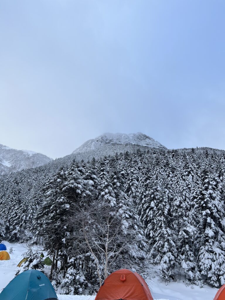 行者小屋は年末年始に小屋泊やテント泊をされた方や、これから赤岳や阿弥陀岳を目指すパーティーで賑わっていました。小屋前のベンチで休憩しつつ、アイゼンやハーネス等を準備します。気温は小屋の温度計で-13℃。みるみるうちに末端が冷たくなってきます。