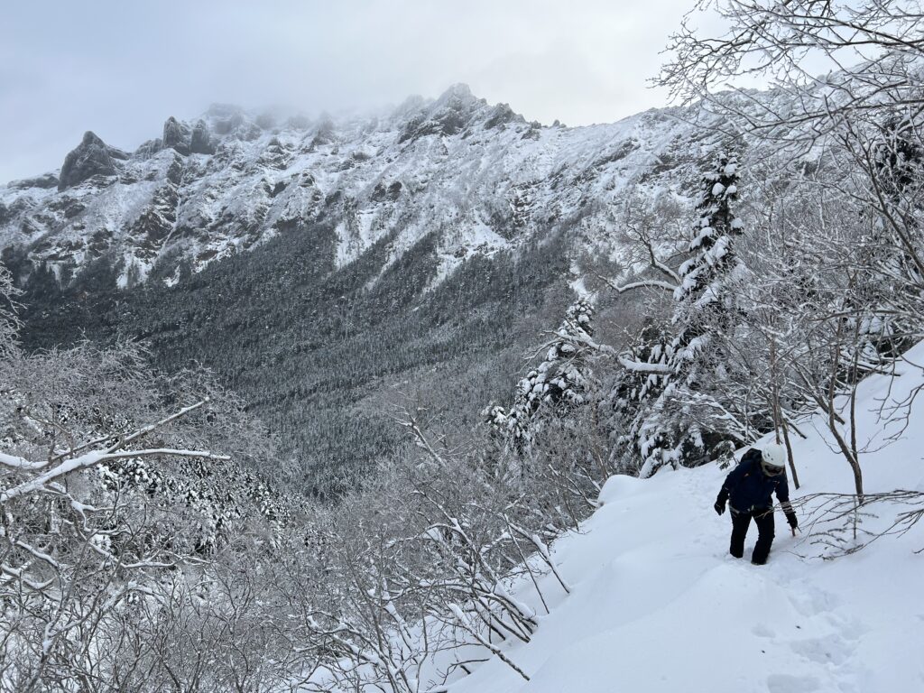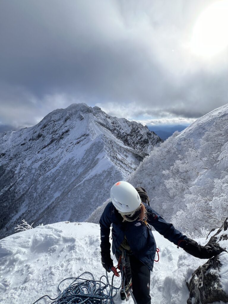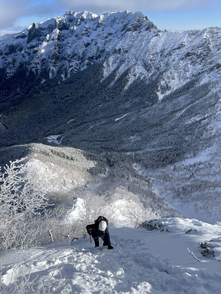 冬用のグローブを付けてのクライミングは手が掛かりにくく少し怖かったです。グローブの厚みを活かして、拳を握ってクラックに突っ込んでバランスを保ちつつ、アイゼンの前爪を岩に引っ掛けながら慎重に登ります。