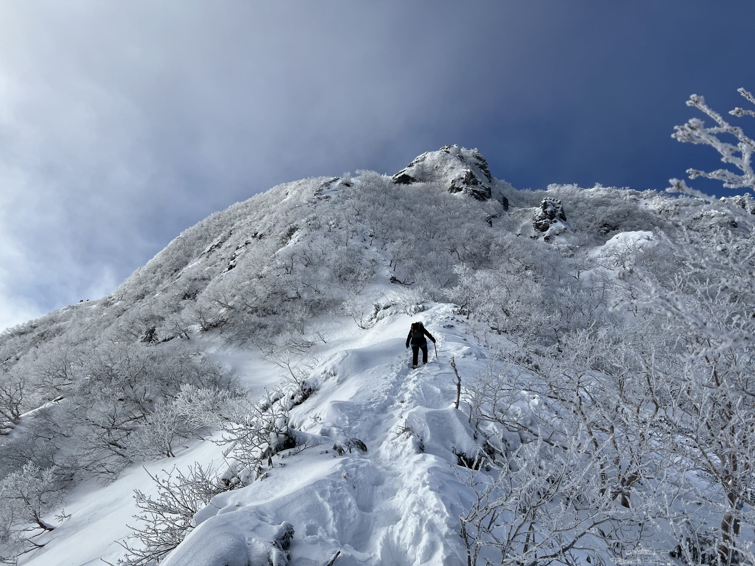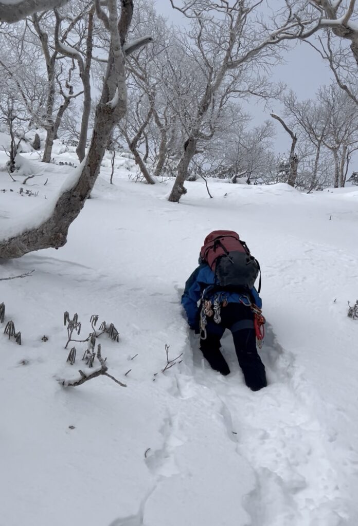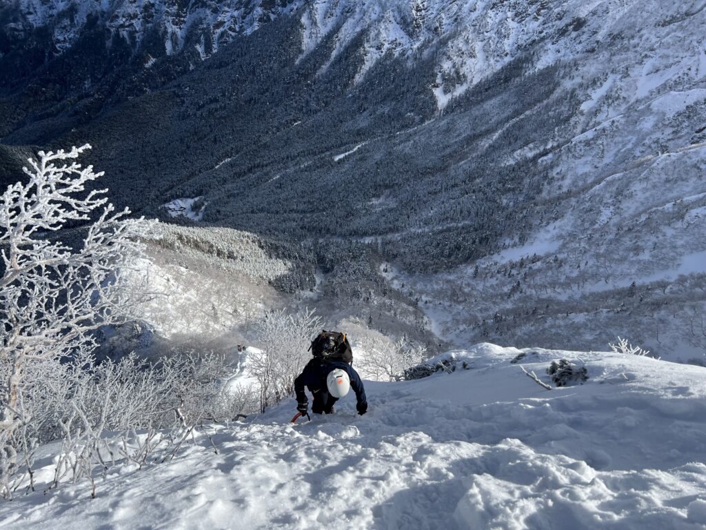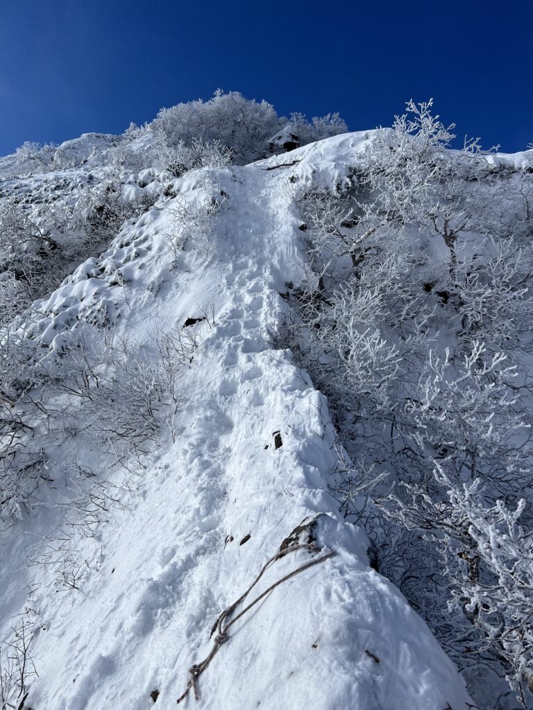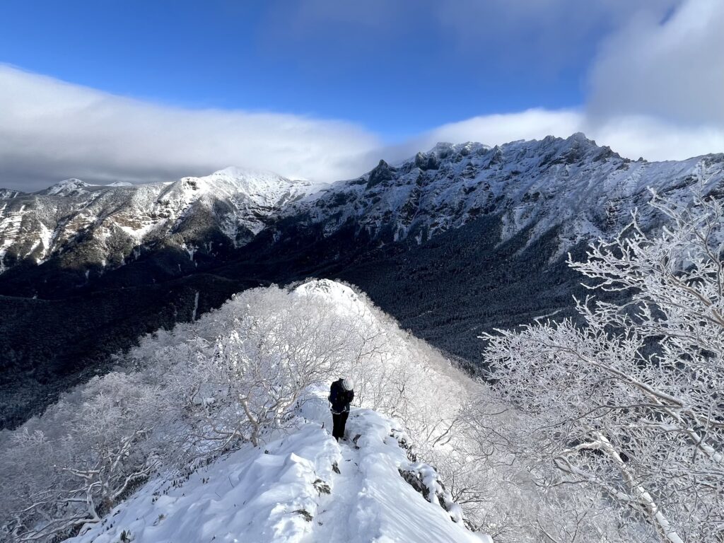 岩壁を超えると現れるナイフリッジは、雪が少なくトレースもしっかり付いていたので歩きやすかったです。2ピッチ目はナイフリッジを超えた先で、支点構築の練習がてらピッケルでアンカーを作ってビレイ。雪に埋まっている灌木を掘り起こしてバックアップにしました。ここまで来ると山頂は目と鼻の先です。