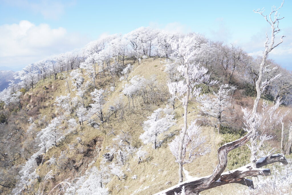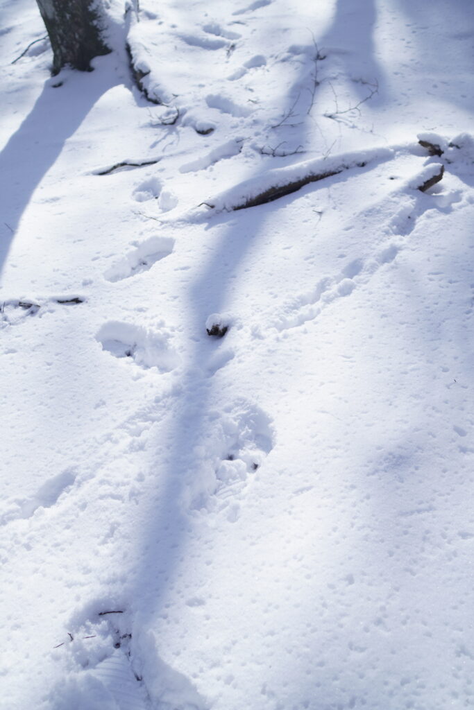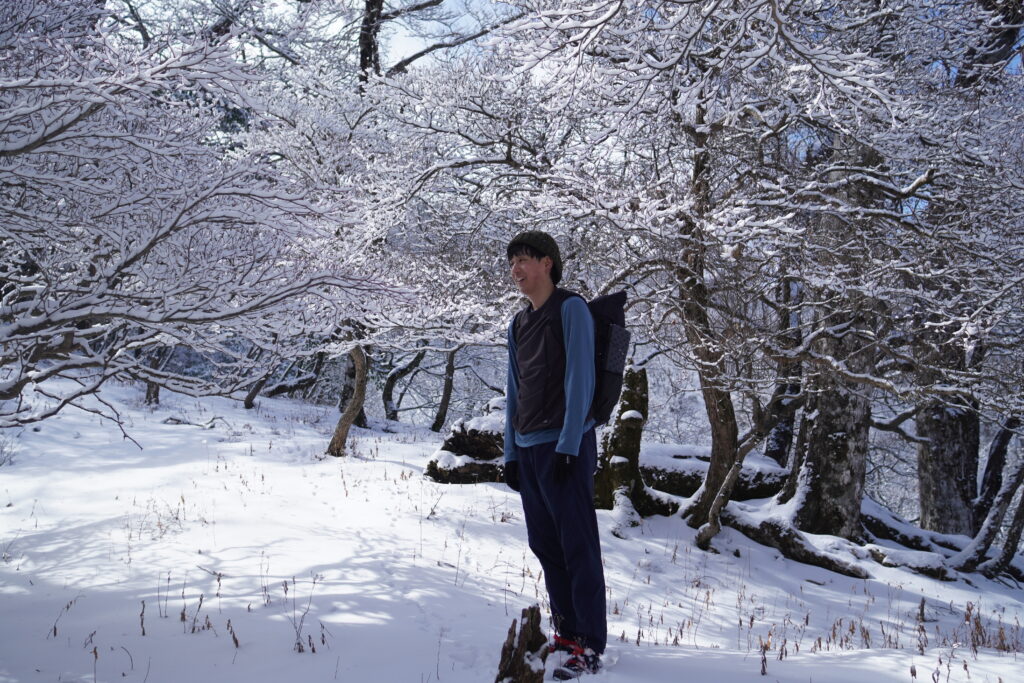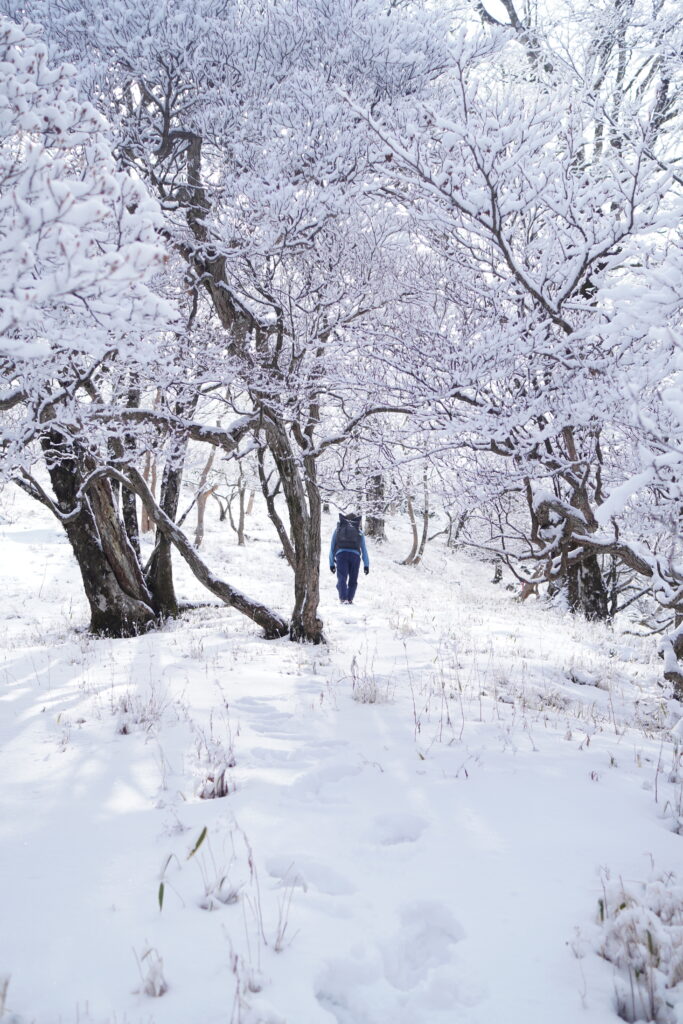 1200m超えたあたりから積雪量が増え、場所によってはふくらはぎまで埋まる程でした。まあまあ雪山だね、と苦笑いしつつ残りの登りをこなします。北面なのでお昼前でも木々に雪が付いていて、白いトンネルになった斜面は幻想的でした。