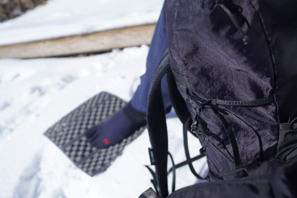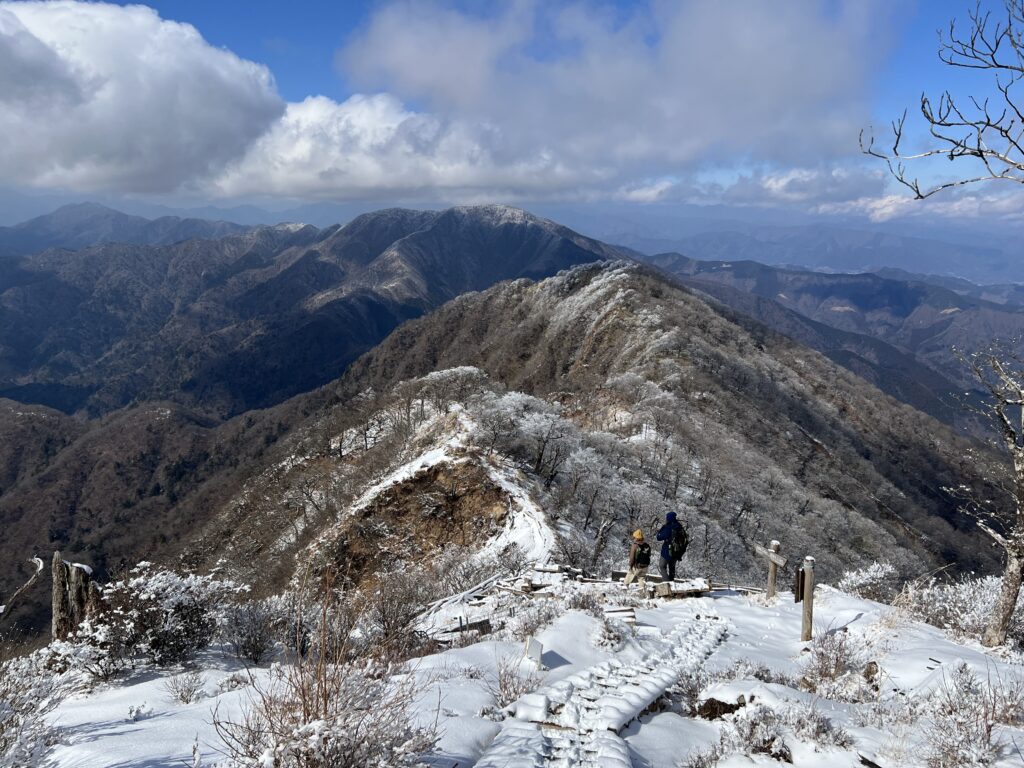 この先はしっかり雪が付いていたので、軽アイゼンを装着して歩き始めます。ちょうど前日の夜中に雪が降ったようで、トレースのないきれいな雪面を一生懸命上がります。雪で踏み跡がだいぶわかりづらく、最初のトラバース箇所に出るまでは難儀しました。そこから先は尾根をつづら折れに上がる道が明瞭になっていて、サクサクと歩き進めました。