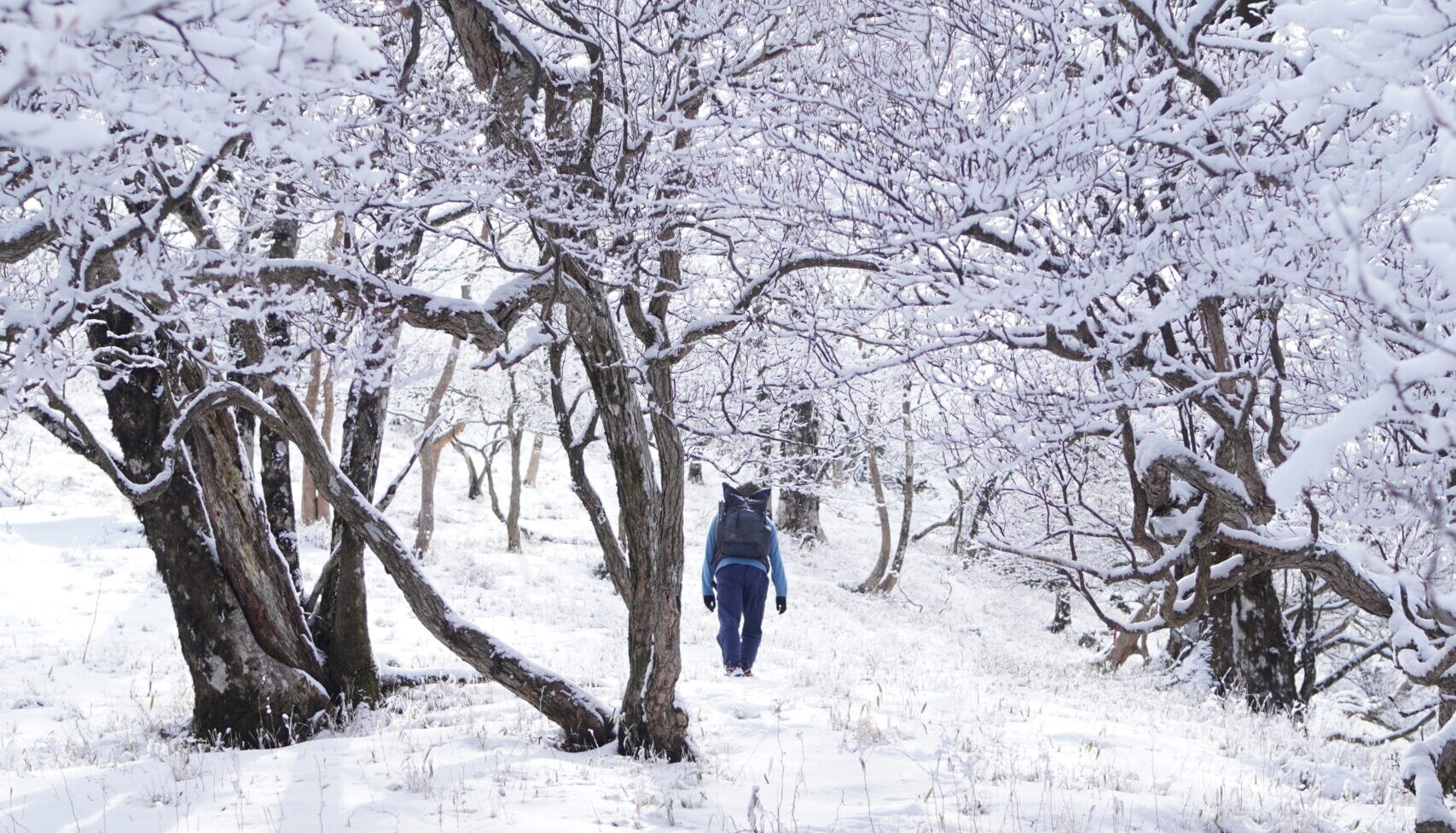 1200m超えたあたりから積雪量が増え、場所によってはふくらはぎまで埋まる程でした。まあまあ雪山だね、と苦笑いしつつ残りの登りをこなします。北面なのでお昼前でも木々に雪が付いていて、白いトンネルになった斜面は幻想的でした。