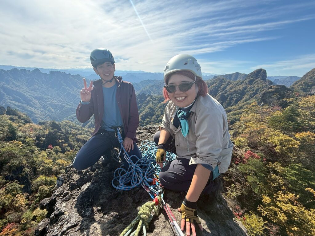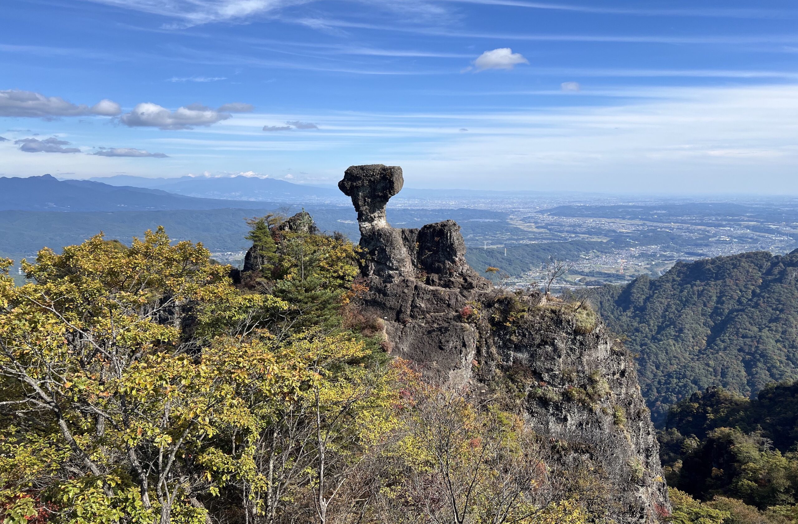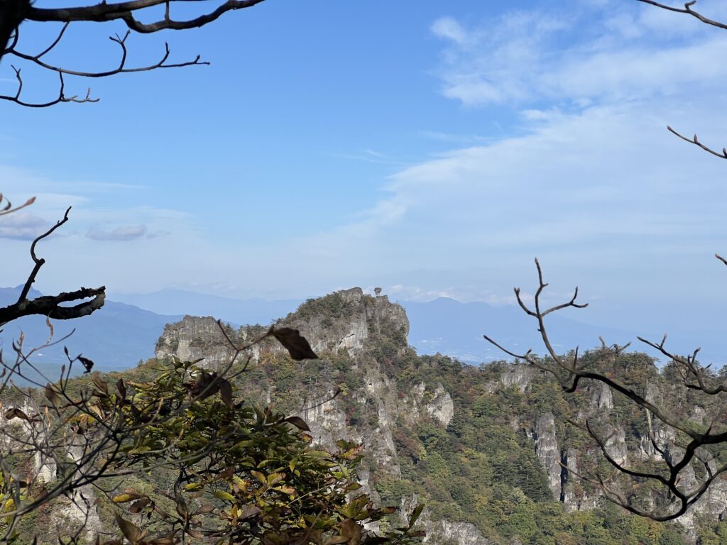 腹ごしらえを終え本日のメインイベント、丁須の頭への登頂を開始。鎖はありますが、念の為ロープで確保しながら登りました。下から見るとそうでもないのに、いざ登ろうとすると、張り出た岩と高度感に恐怖心が…。冷静に足元を見てぐっと立ち込み上がると眼前に広がる大展望。関東平野の広さにおお〜と声が上がります。群馬側から見る八ヶ岳はいつも見ているものとは全然違う形でなんとなく違和感があります。浅間山は妙義から見てもちょっと黄色くなっていました。ちょうどカラマツの紅葉が見頃で、金粉をかけたよう、なんて巷で話題になっているらしいですね。