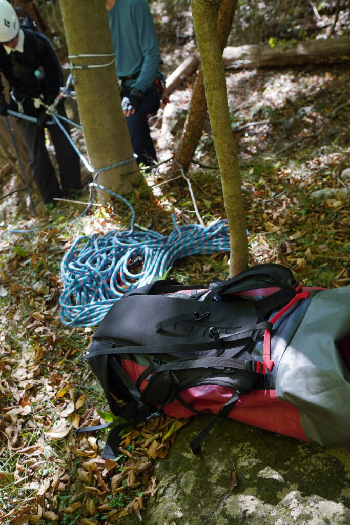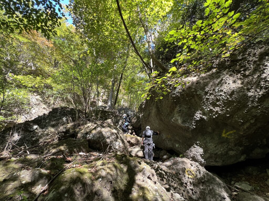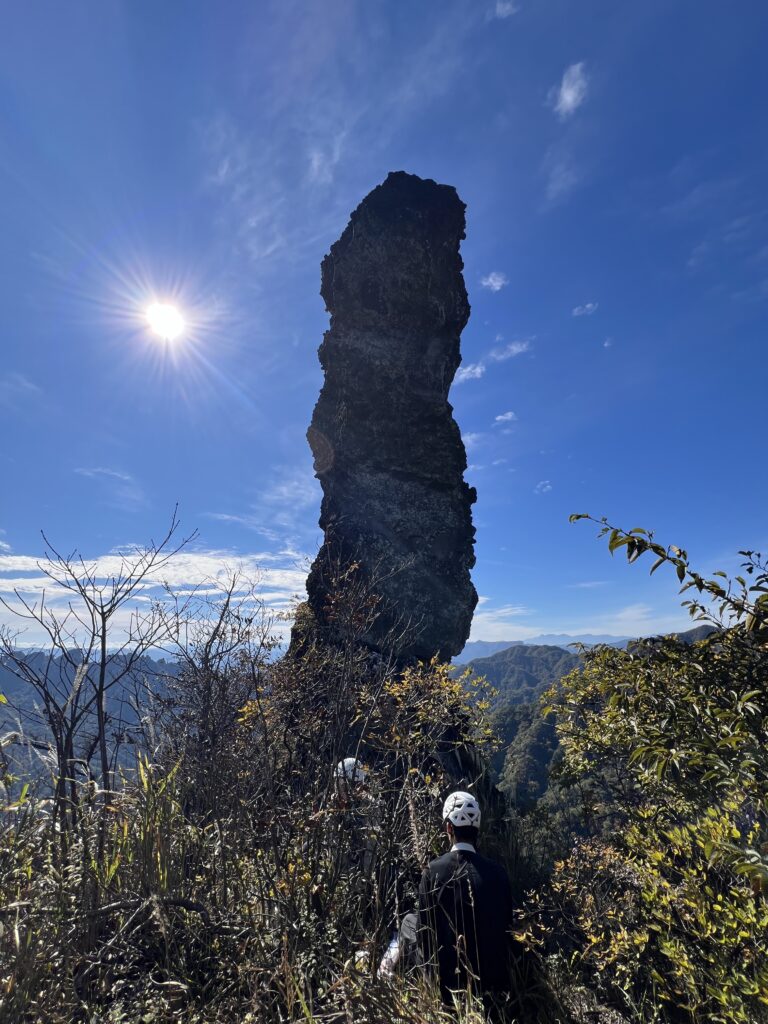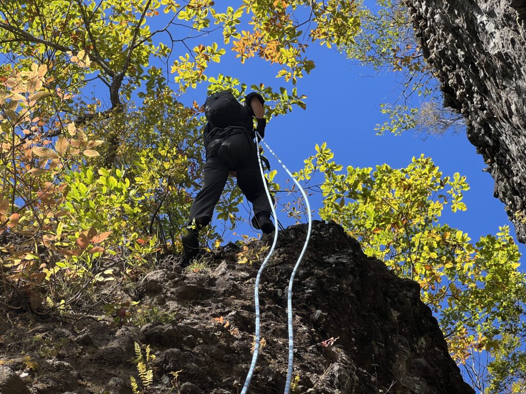 さて、この日は丁須の頭という岩を目的にしており、そこで懸垂下降をする予定だったので途中の斜面で懸垂下降のレクチャーをしました。この日のためにギアを色々揃えてもらったので、できる限り実践してもらおうと思います。Sさんは初めての懸垂下降を終え「面白い!」と好感触。その場でしばらく談笑していると上の方から聞き覚えのある声が聞こえてきました。なんといつもお世話になっているガイドさんとばったり遭遇。数ある山の中でピンポイントで同じ場所にいることにご縁を感じます。