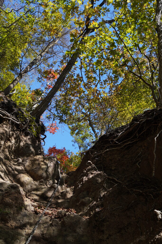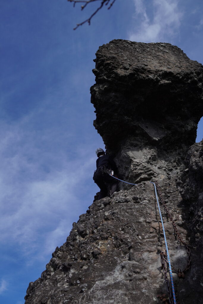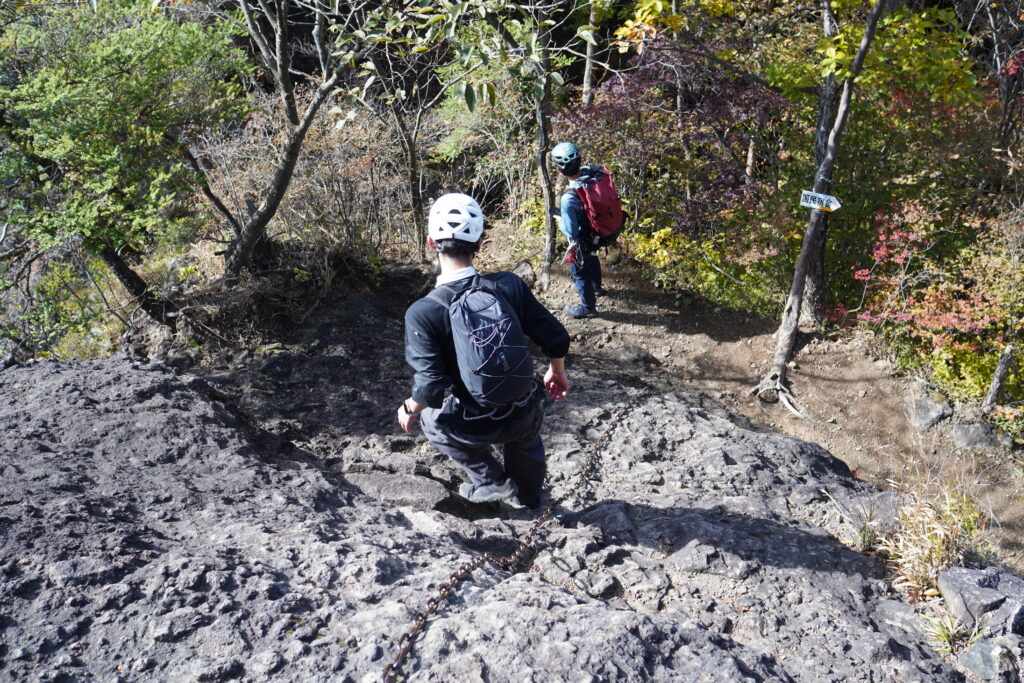 レクチャーを終え、目的の丁須の頭へ向け再出発。登山道は段々と急になっていき、ところどころ現れる鎖場や急な土の斜面が妙義らしさを醸します。登山口の国民宿舎には大きなルート案内の看板があり、「ハイキングコース」と表記されていましたが、ハイキングとは?とツッコミを入れたくなる道です。看板が建てられた頃は普通に沢山の人が歩いていたのか、と思うと時代の移り変わりを感じます。