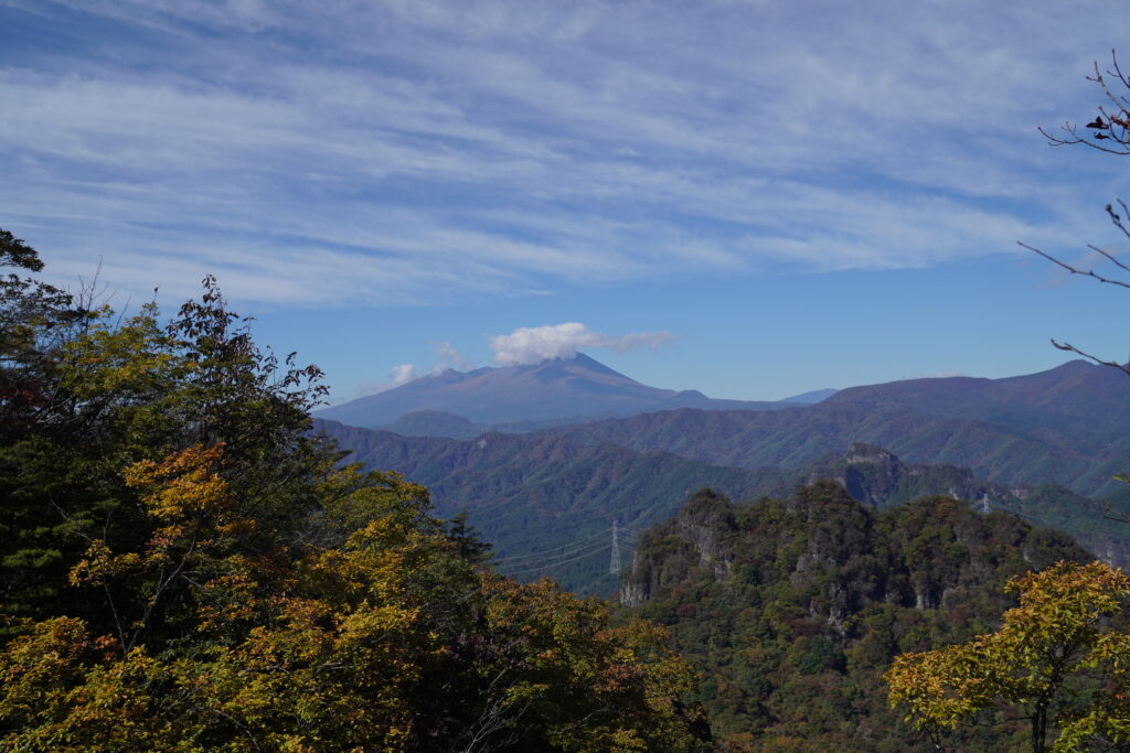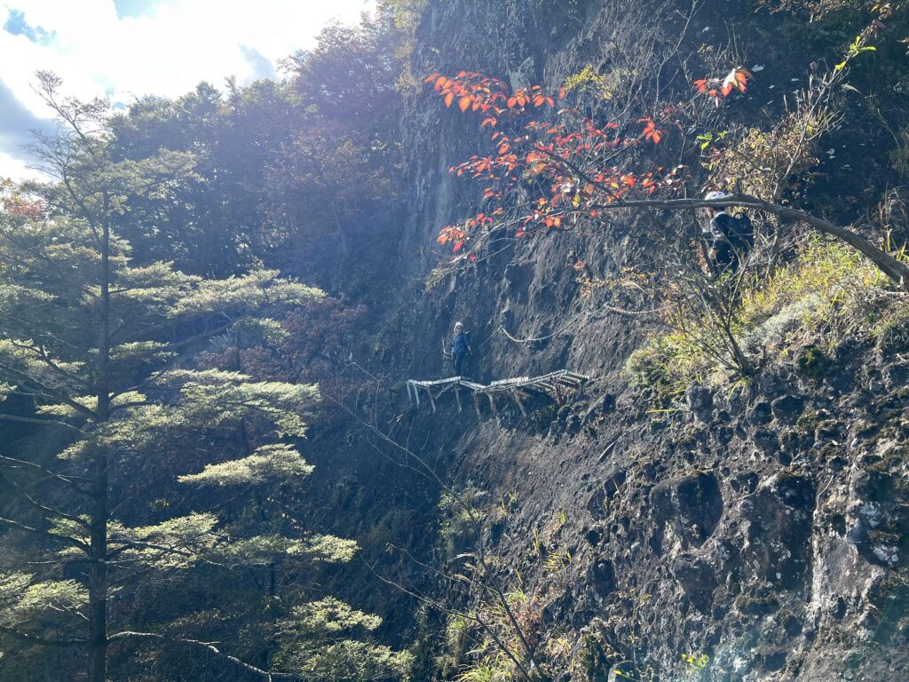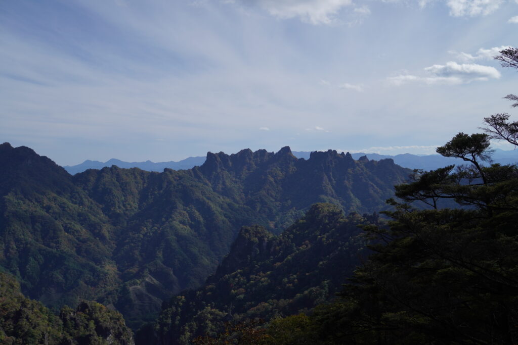 登山道の奥にいい感じのテラスがあったので、ここでちょっと早いお昼休憩をとることにしました。コーヒーを飲みながら日向ぼっこをしているとすっかりまったり気分になってしまい、自分が結構急な場所にいることを忘れそうになります。紅葉が始まった木々の奥に鋭い岩峰。日本庭園はこういう景色を再現したくて作られたのだろうな〜なんて思いつつ、「いとあはれ」な景色をじっくりと堪能しました。
