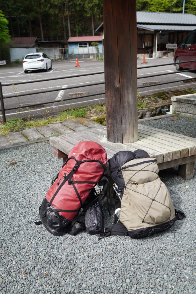 駐車場から登山口まではしばらく温泉街を歩く。寸又峡温泉は温泉の他に、有名な観光ポットである「夢の吊り橋」があり、平日の朝ながら観光の方がチラホラ歩いていた。その中を泊まり装備の重たいザックを背負いながら歩くのは少々目立つ。水場が限られていてる今回のルートでは水を補給できるのが2日目の夕方になるため、私は5L、妻は3Lをスタートから担いだ。