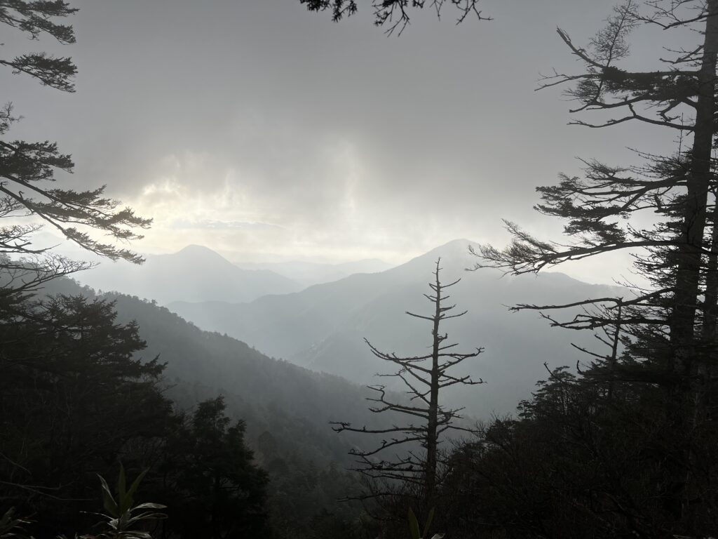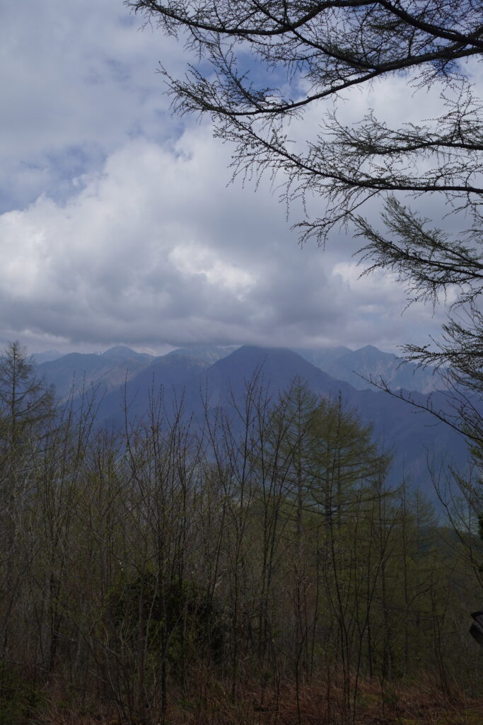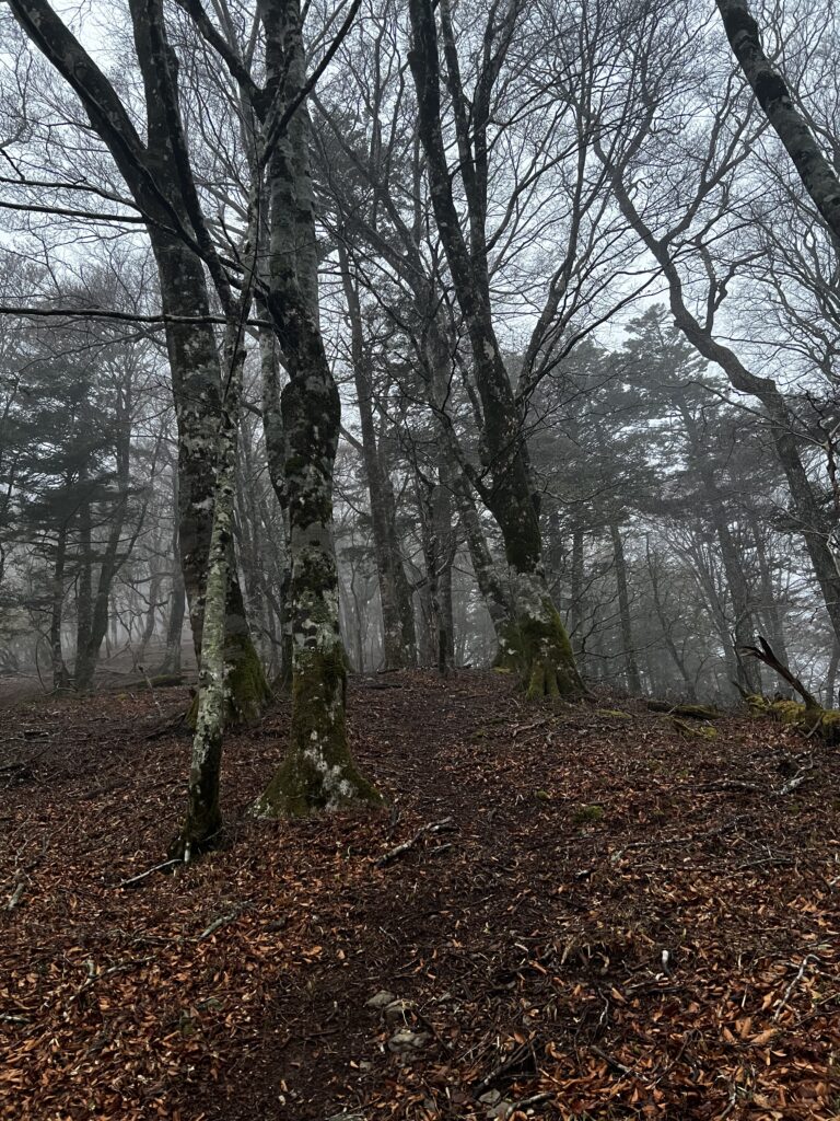 鋸岳の先のコルあたりは綺麗な広葉樹林が広がっていた。その頃には雨は止み、時折ガスの切れ目から太陽が見える様になってきた。肌寒い時期の必須アイテムであるアルファハラマキを忘れ、お腹が冷えて少し痛くなっていたので、余計に日差しの暖かさが身に染みてありがたかった。ここまでは悪いコンディションだったが、そのおかげで霧が晴れた時の感動が増した。良い天気だけではない、刻々と状況が変化することに対応していくのも縦走の面白さだ。