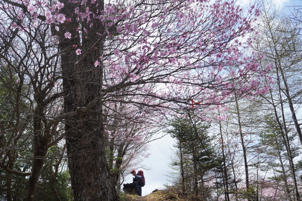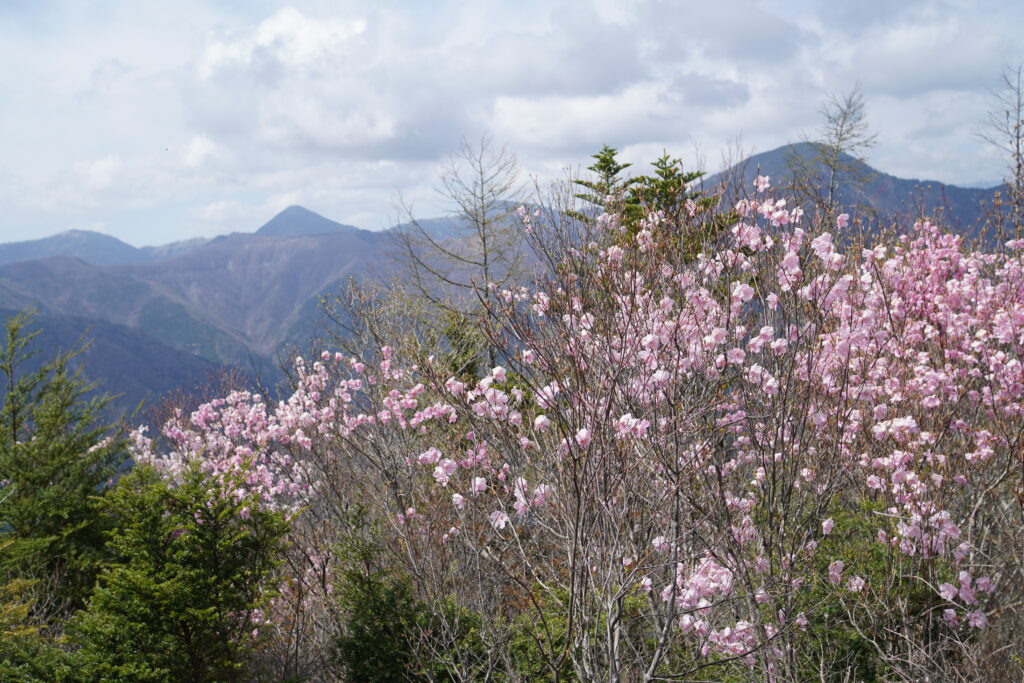 ウツナシ峠からひと登りすると天水というピークが現れる。山頂はアカヤシオが咲き誇り、春爛漫といった様子。北側がひらけていて明後日歩く山の連なりを見ることができた。