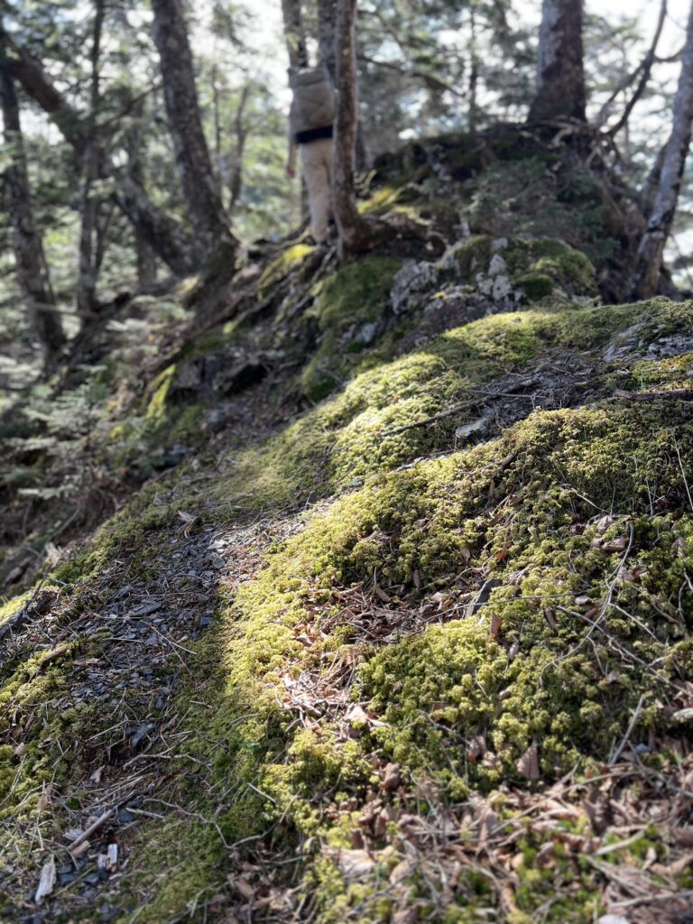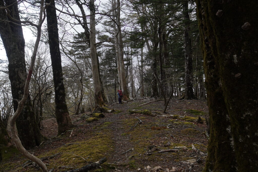 次の二ツ山に向けての下りは例によって急斜面で濃い笹薮だ。まるで深雪をラッセルするかのように笹をかき分けながら下っていく。コルを過ぎて二ツ山に近づくと次第に笹薮が落ち着き、苔が目立つようになってきた。コメツガと苔の森は北八ヶ岳を思わせる雰囲気で、見慣れた景色に安心感を覚えた。