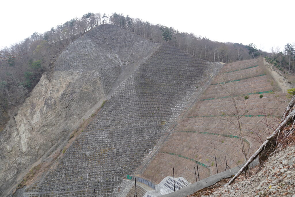 天水から先は細尾根やザレた斜面がありこれまでとは少し雰囲気が異なった。西丹沢を思わせるような道を歩き、ゆるやかな板取山を超えると突然人工物が現れた。ここはホーキ薙と呼ばれる大崩壊地で、治山工事が施された山肌は大迫力だ。