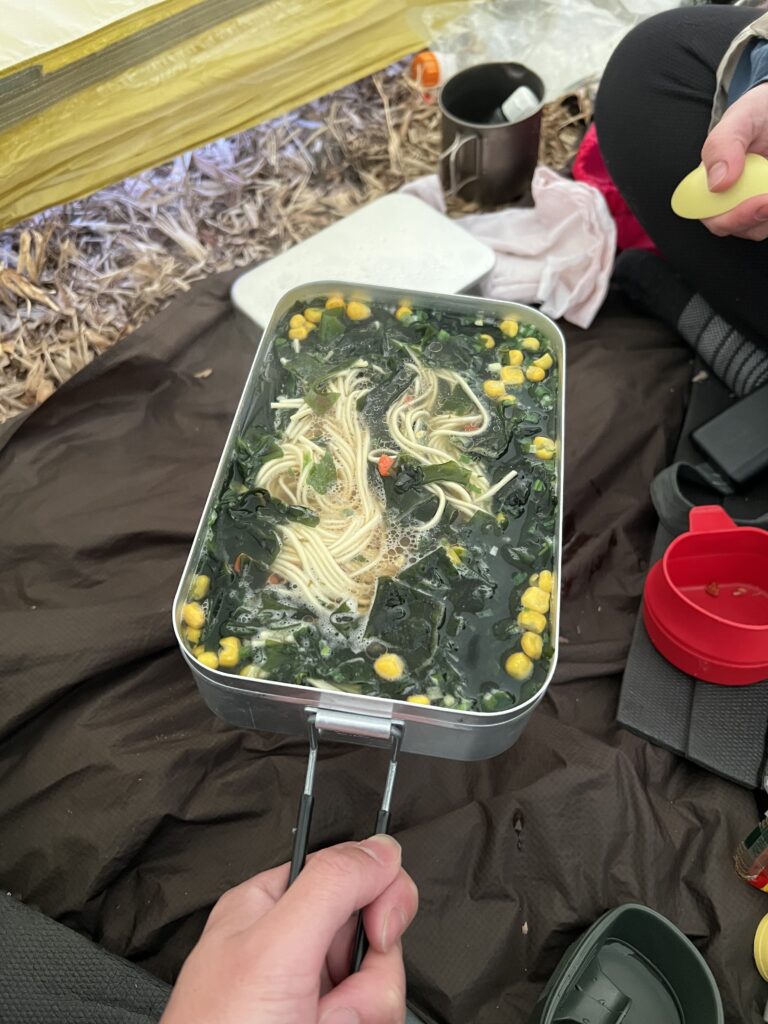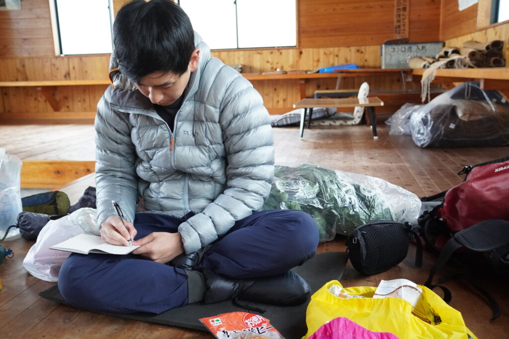中は広く、驚くほど綺麗だった。ひとしきり小屋内を探検して、温かいコーヒーを淹れてホッと一息つきながら日記を書く。一日目にして残しておきたいことがたくさんだ。夕ご飯は春雨丼とチゲスープとチーズでしっかりと栄養を摂った。小屋は我々だけで、広い板の間で入念にストレッチをして就寝した。