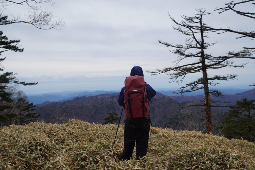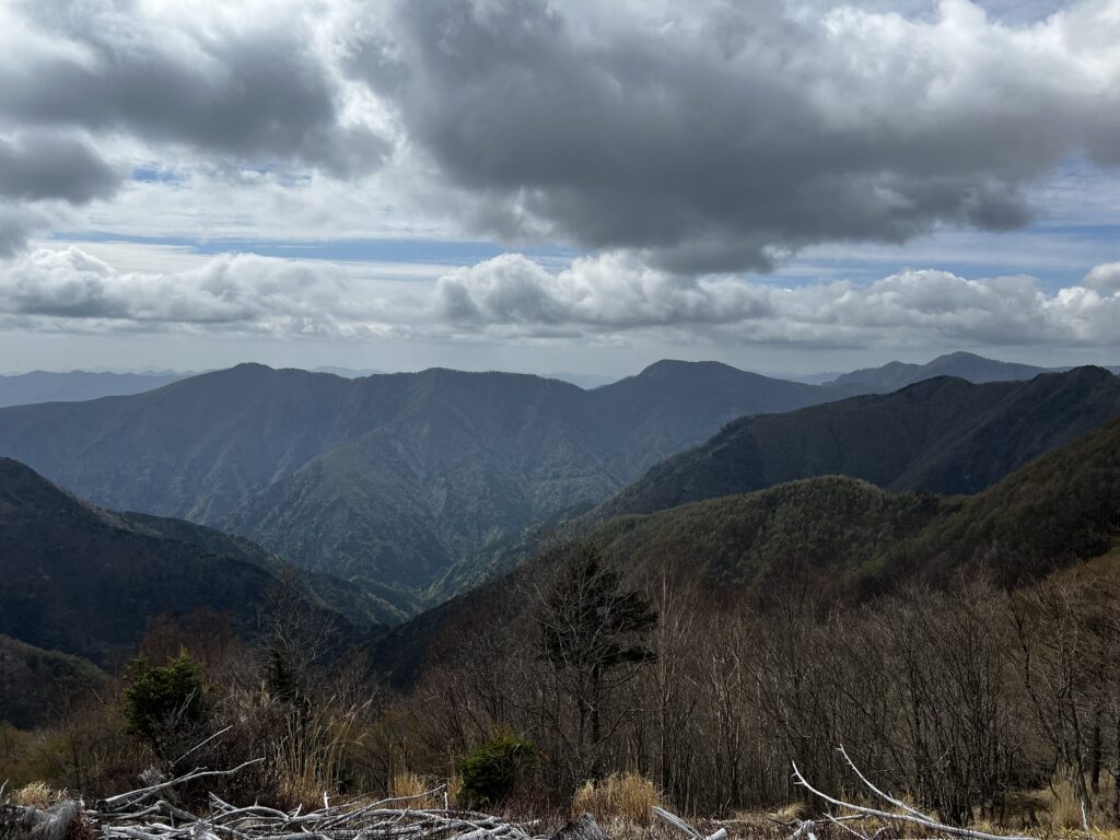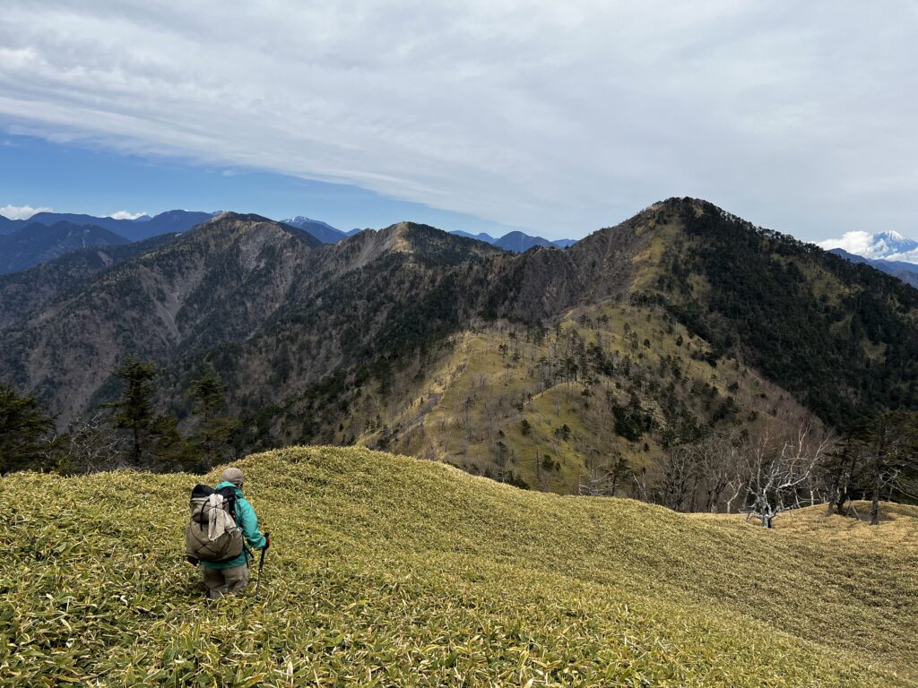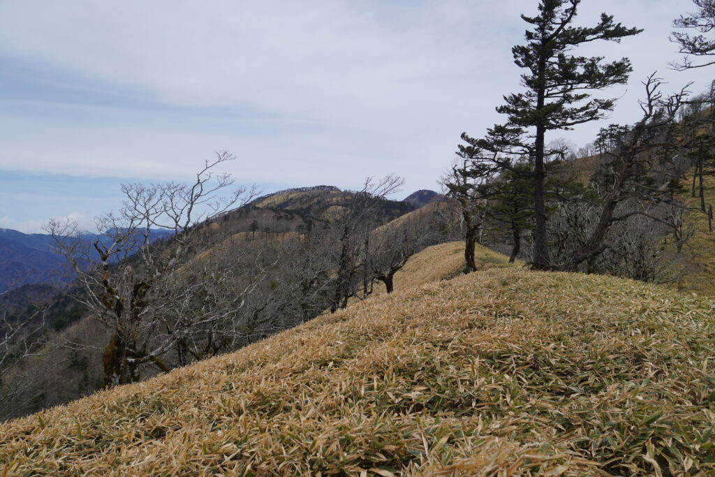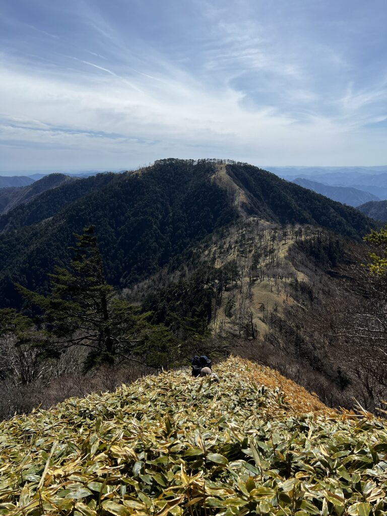 二ツ山を超えると再び笹の草原が広がるが、背丈は低く、深南部縦走が終盤を迎えていることを物語っていた。途中のヘリポートからは黒法師岳や一昨日歩いた山犬段に続く稜線が一望でき、「遠くまで来たなぁ」と感傷に浸った。