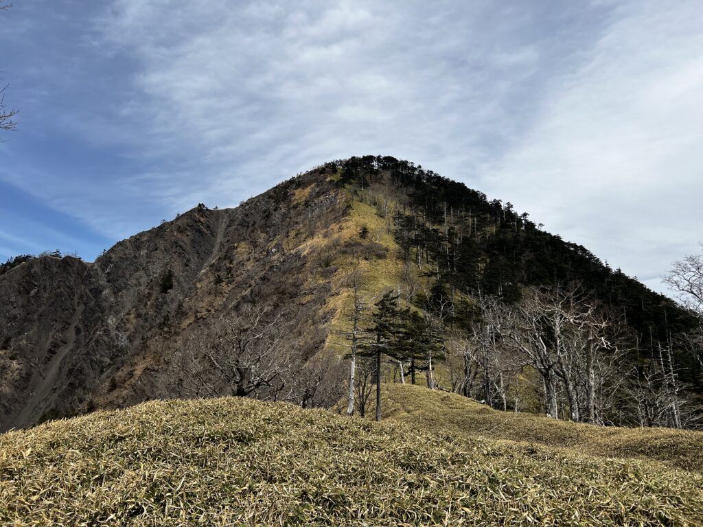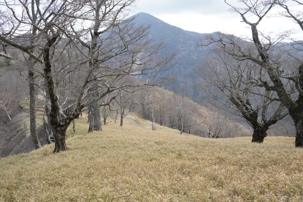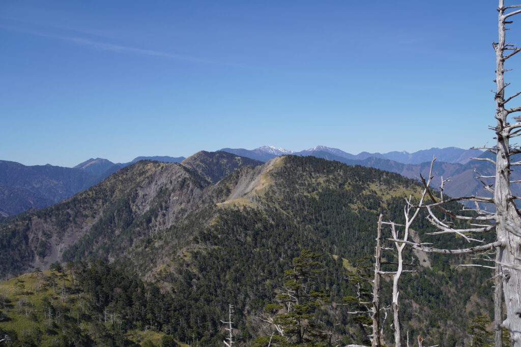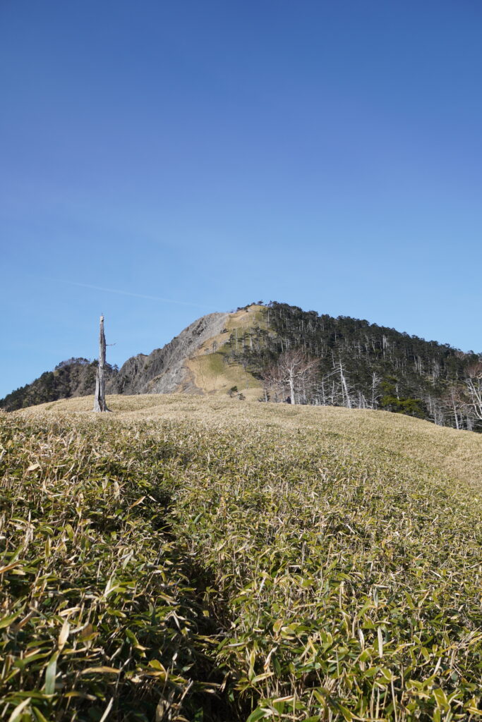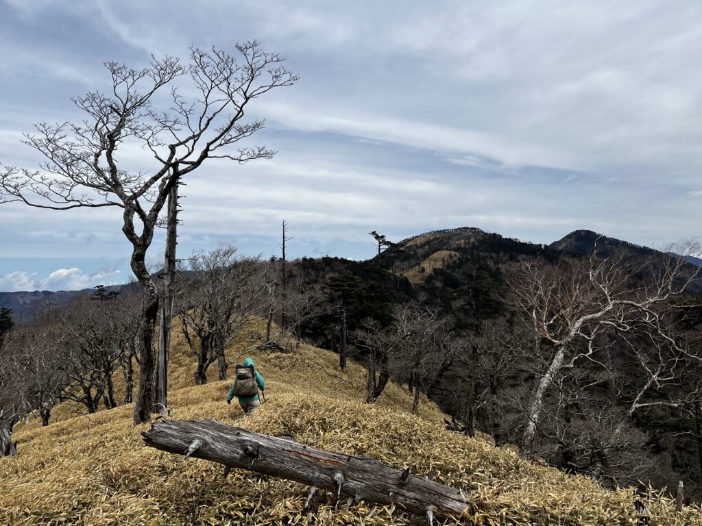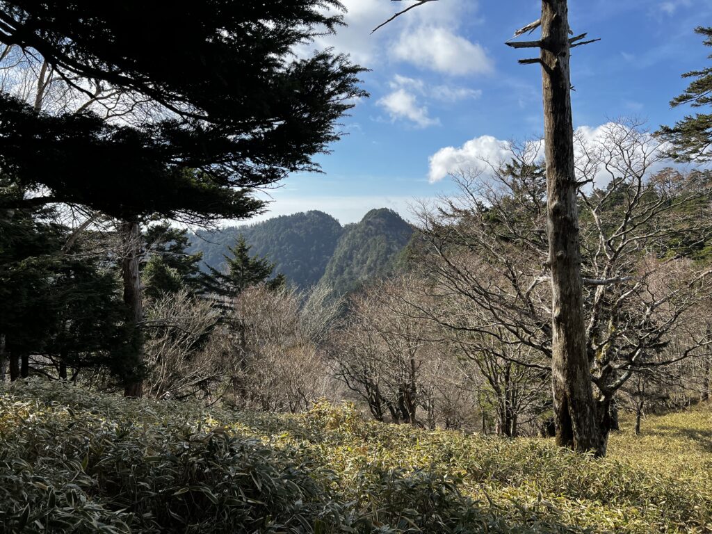 二ツ山を超えると再び笹の草原が広がるが、背丈は低く、深南部縦走が終盤を迎えていることを物語っていた。途中のヘリポートからは黒法師岳や一昨日歩いた山犬段に続く稜線が一望でき、「遠くまで来たなぁ」と感傷に浸った。