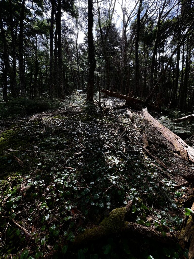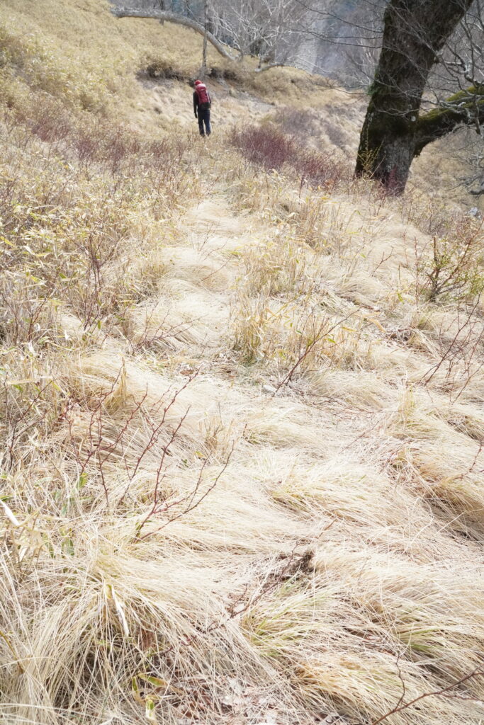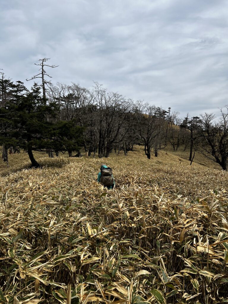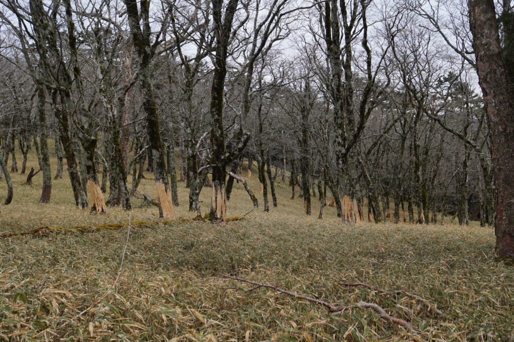 バラ谷の頭に近づくと一層笹が背丈を増す。時折倒木が隠れていたりするので躓かないよう慎重に歩かなければならない。途中、樹皮を鹿に食べられた木がそこら中にあり痛々しく感じた。足元もよく見ると鹿のフンだらけだ。