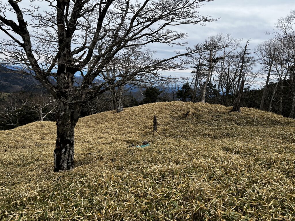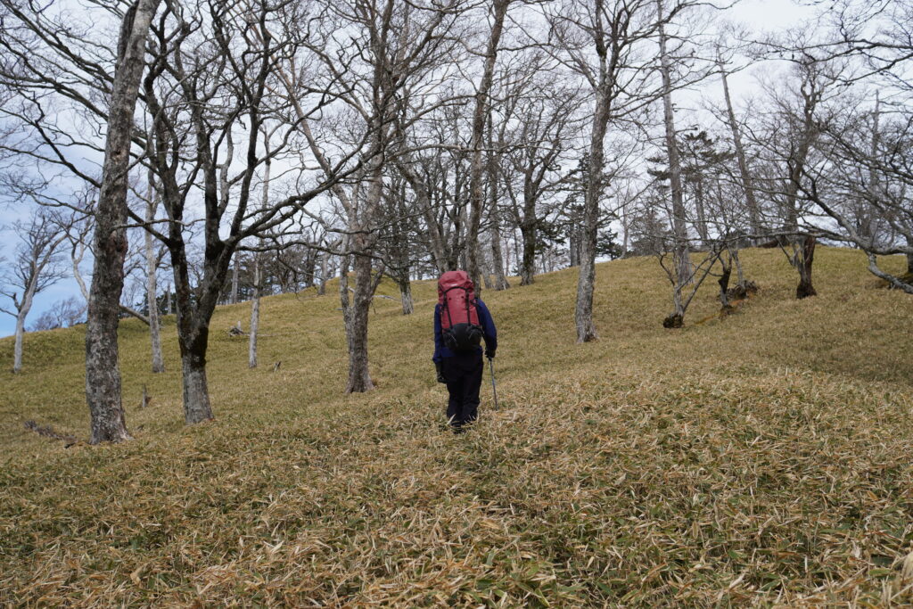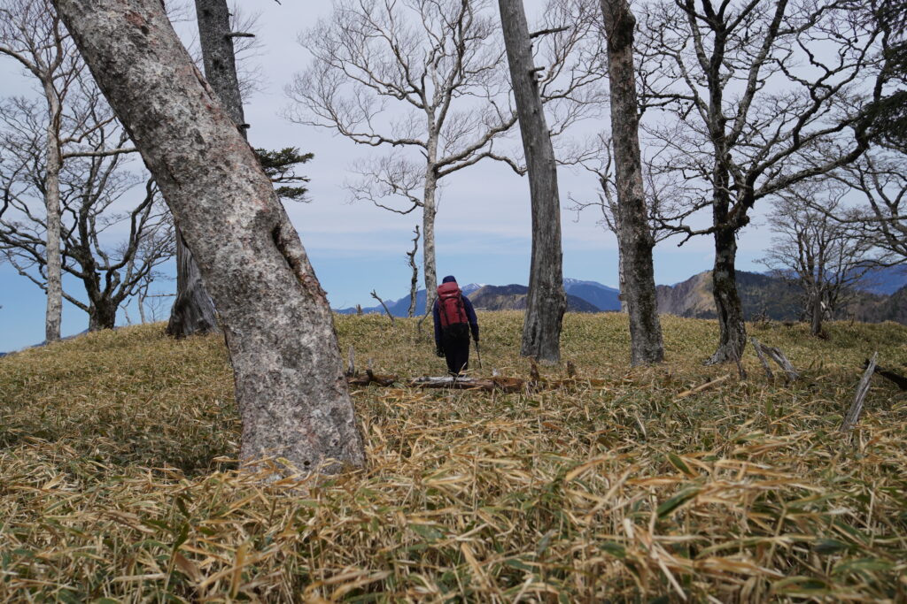 房小山まで来るとすっかり青空が広がり、気持ちの良い笹の草原歩きとなった。明確なトレースは無く、あるのは鹿が駆け回ったであろう踏み跡と、時折腰以上の高さになる笹薮。ガサガサと笹を漕ぎながら歩くと、深南部にやってきたという実感が湧いてくる。