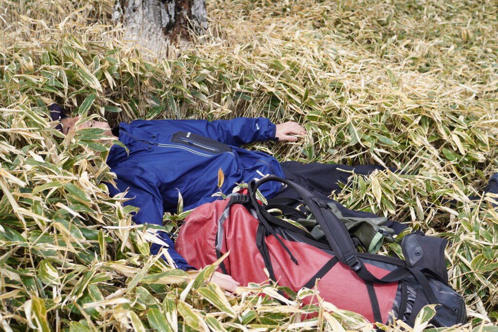 カモシカ平、なんて素敵な名前だろうか。まさに笹の別天地と言える風景が広がってる。時刻は15時過ぎ、今日はここまでとした。余裕があれば丸盆岳のピストンも考えていたが、又今度来る時にとっておこうと言い訳をして、濡れた装備を広げて乾かして、マットを広げてしばし昼寝をした。