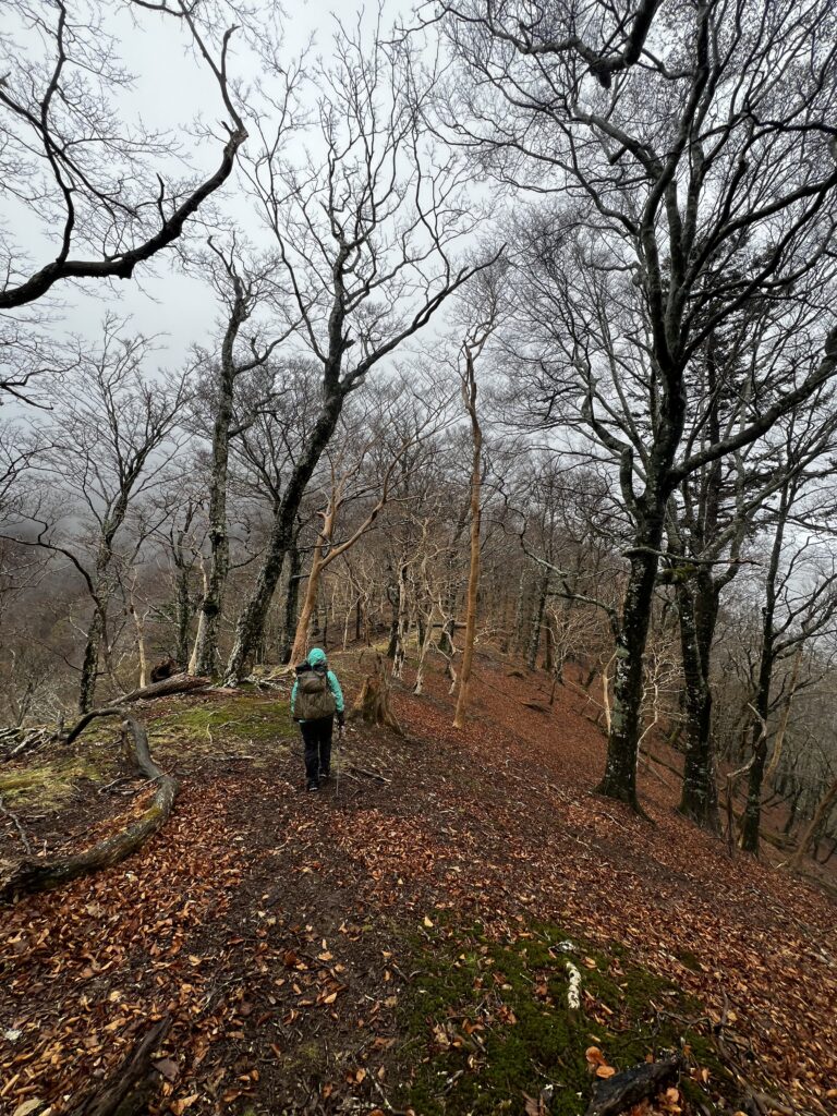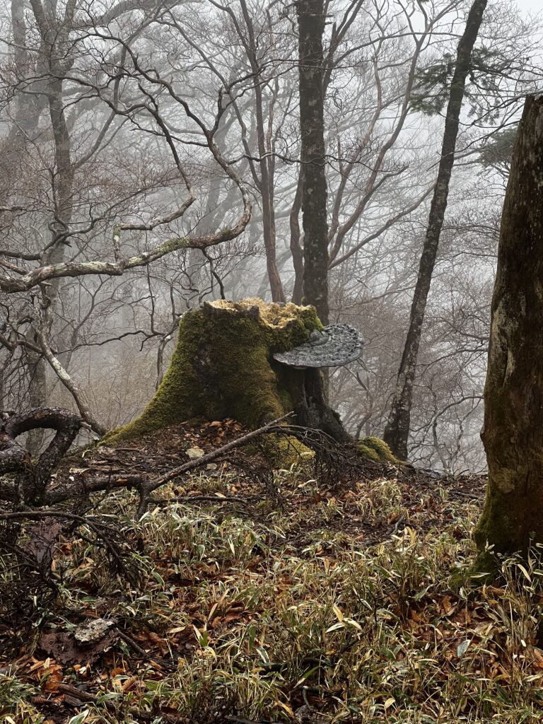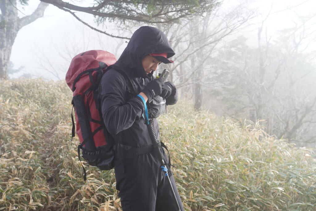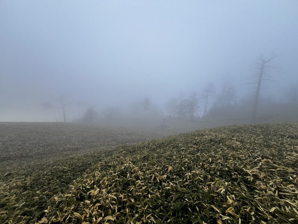 冷たい雨風に打たれ続けて体の芯から冷えを感じ始めたので、風の遮れる場所でしっかりとエネルギーを補給した。千石平あたりから笹薮が姿を表し始める。
