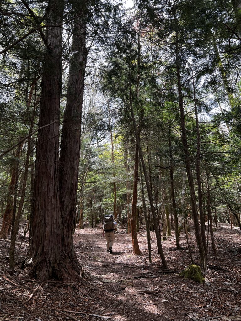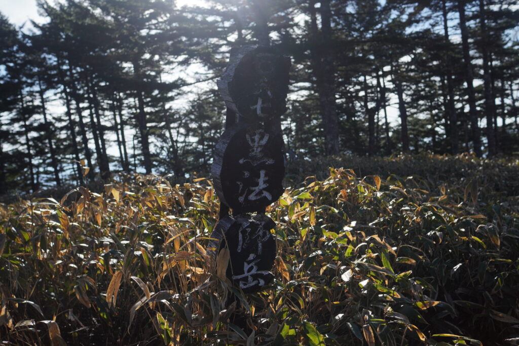 カモシカ平から1時間程で黒法師岳の山頂に到着した。コメツガと笹に覆われた山頂は、以前来た時は薄暗く地味だなぁという感想だったが、この日は木々の間から朝日が差し込み、良い雰囲気だった。山はタイミングによって様々な表情を見せる。それを楽しむことができるのもゆっくりと山を歩く醍醐味だ。