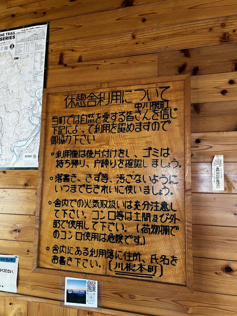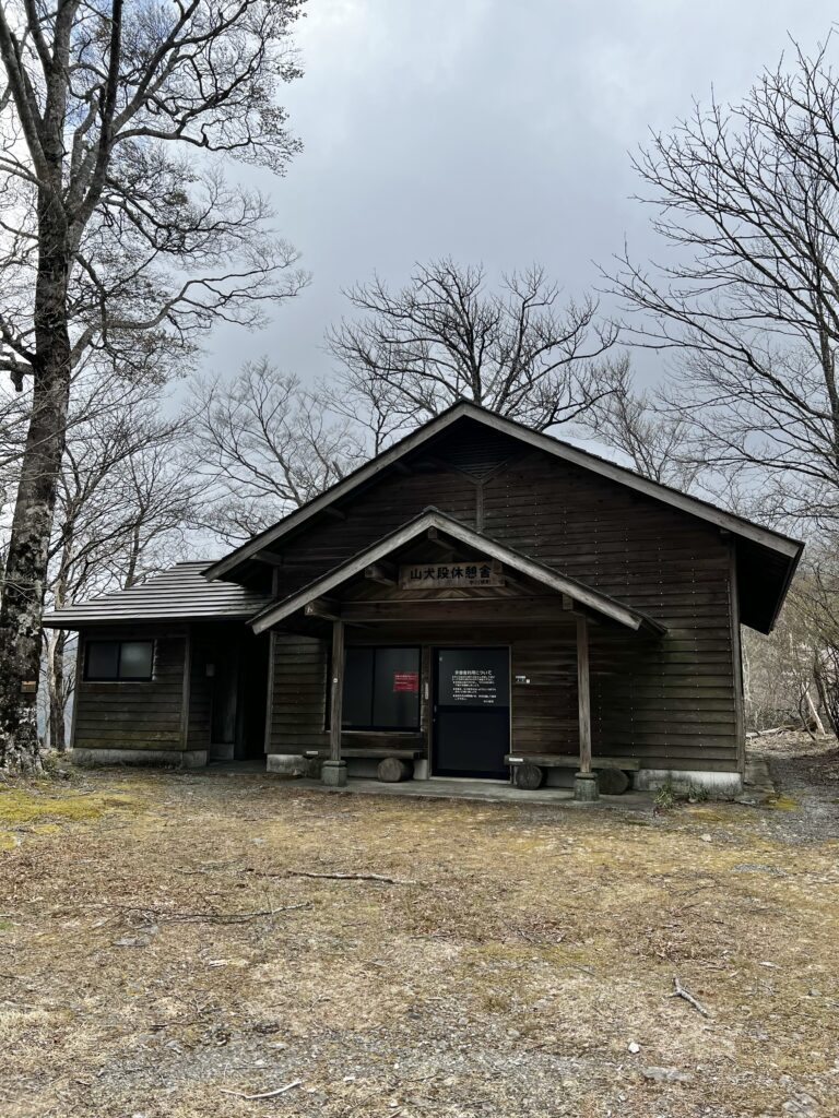 ホーキ薙から八丁段を超え程なくして林道に合流し、16時前に山犬段に到着した。夜から明日午前にかけては雨予報なので、今夜はしっかりと雨風をしのげる山犬段休憩舎にお世話になった。この先に300名山の高塚山があり、時期によってはバスで犬山段まで来れるそう。高塚山はもちろん、ここから寸又峡温泉方面へ歩いて下山後に温泉街を観光するのもオススメだ。