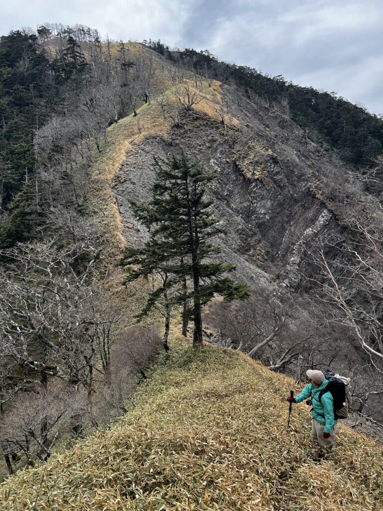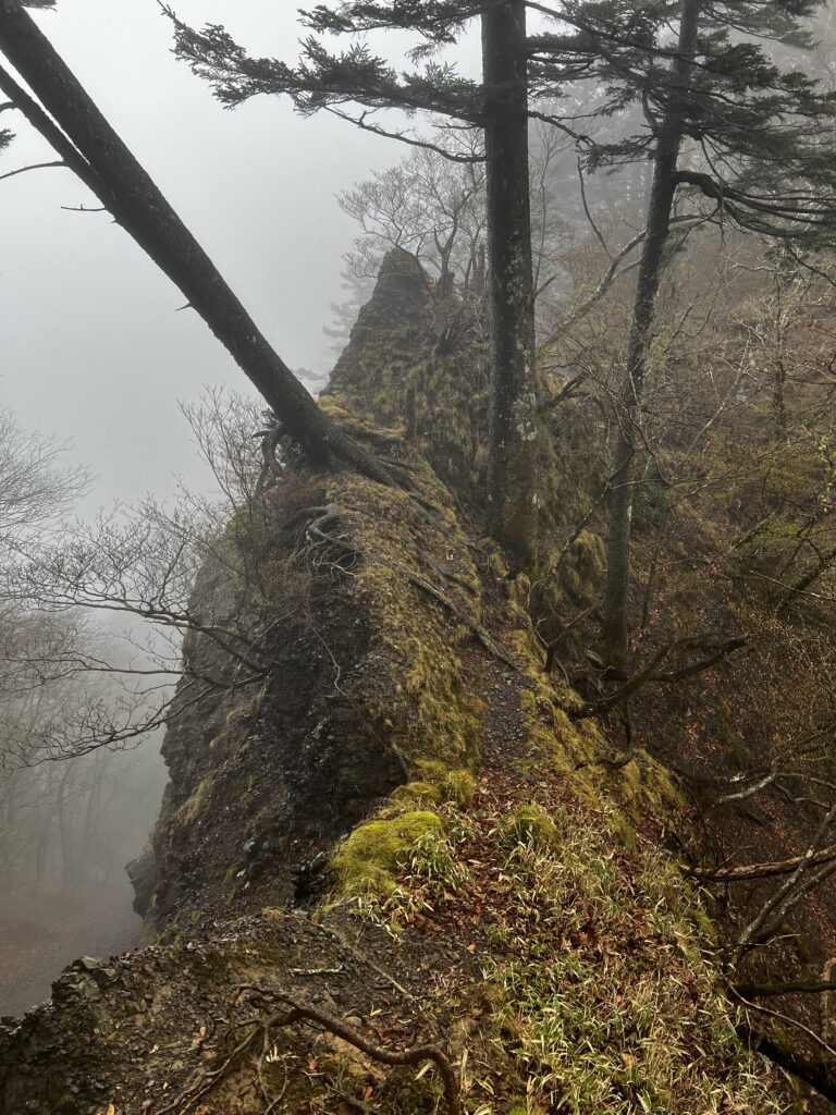 その先、三ツ合山を過ぎたあたりから雨風が強くなってきた。ここから先は細尾根や急なアップダウンが連続する区間だ。気温は5℃と肌寒く、激しいアップダウンの度に通るコルでは風が吹き抜け、横殴りの雨に打たれた。