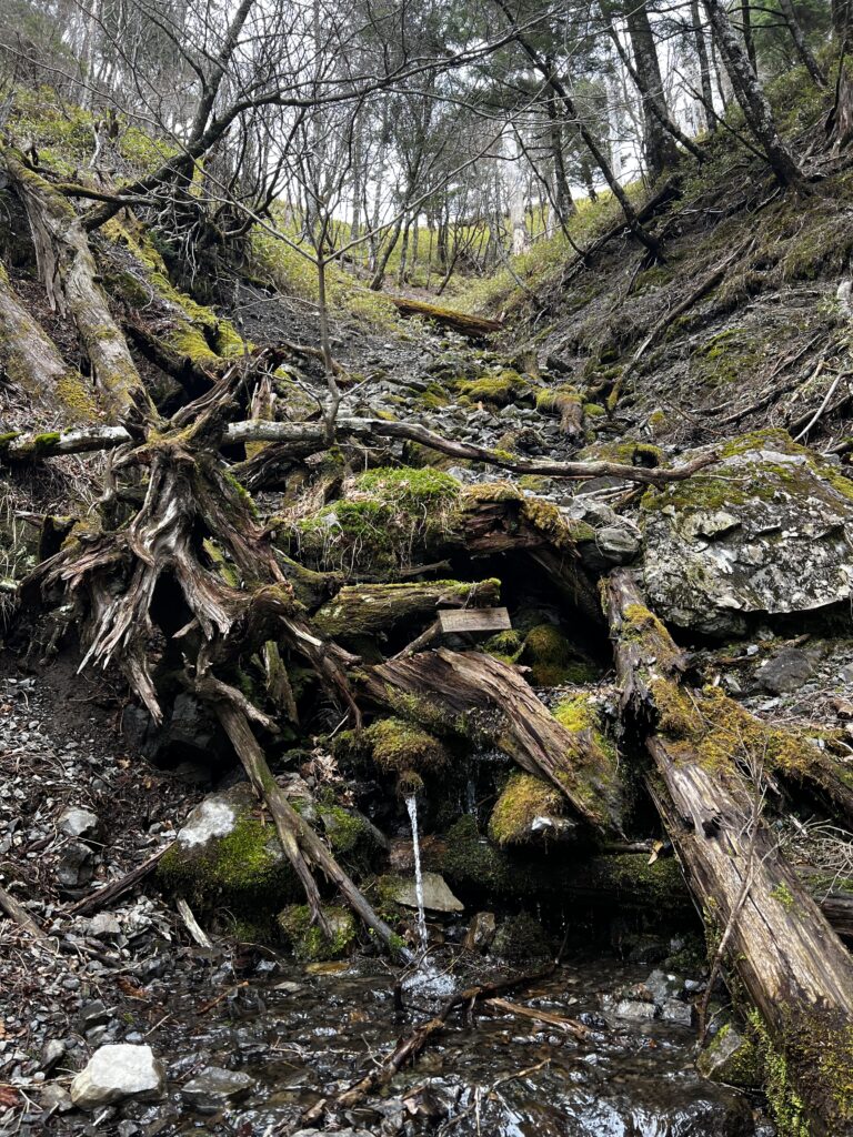 休憩もそこそこに再び歩き始める。今日の最大のミッションである水の確保が待っているのだ。バラ谷の頭からは笹が覆いかぶさった急斜面を100mほど下りて、コルから沢沿いを更に下る。笹の急斜面はチェーンスパイクがあるとしっかりグリップして歩きやすい。さっきまで雨が降っていたので水の心配は無く、案の定水場はジャブジャブと冷たい水が出ていた。