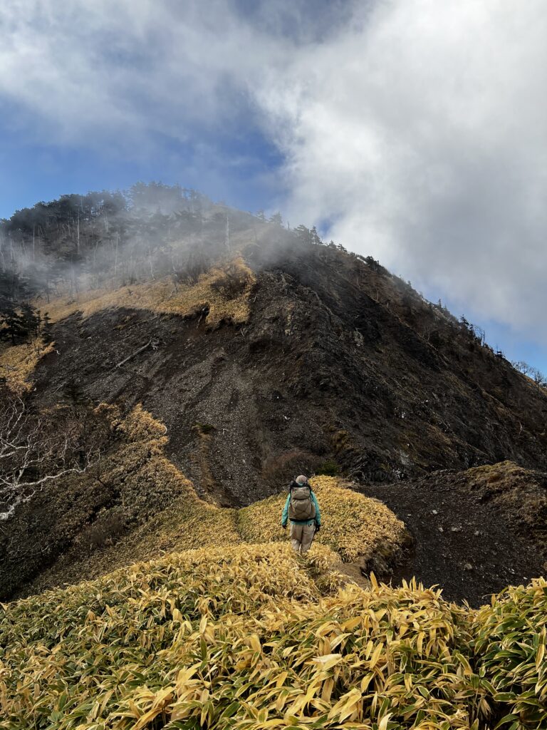 出発する頃はあたりはまだガスの中。昨日下ってきた黒法師岳からの道を登り返していく。笹の斜面が大きく抉れたあたりからガスが晴れてきた。